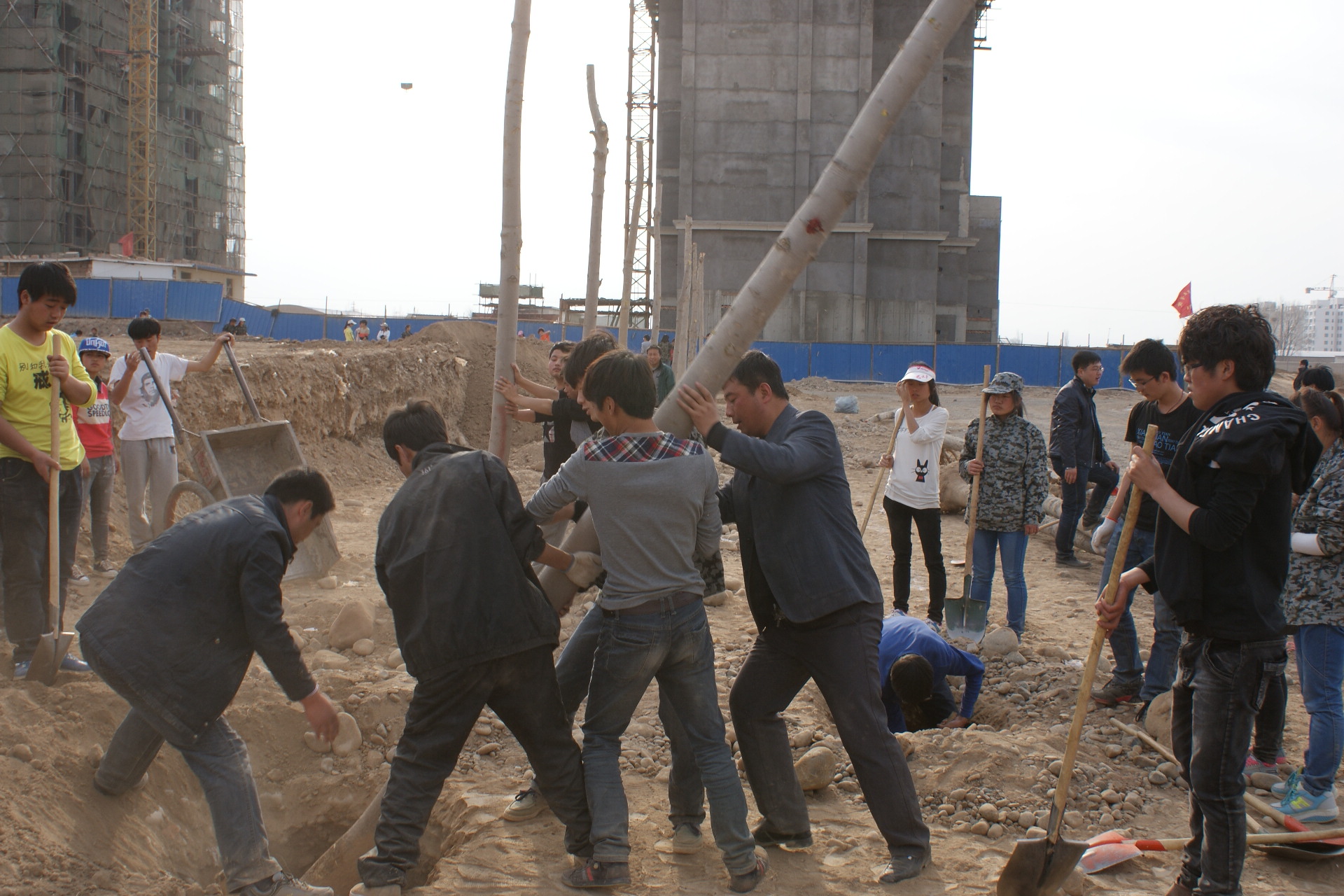 植樹現(xiàn)場一派忙碌的景象,大家有秩序地領取工具,三五一組,分工明確,揮動鎬頭,掘土挖坑,再將一顆顆樹苗埋窩、培土、踩實、澆灌。經(jīng)過三天的緊張勞作,我系師生在指定區(qū)域完成了280個樹坑的開挖和樹木栽植任務。