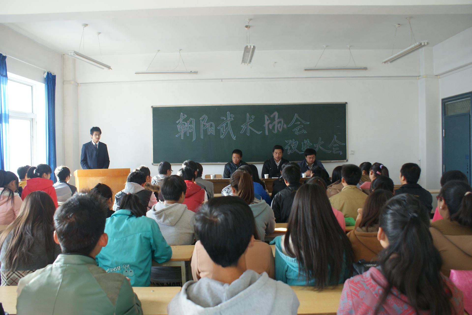 為了進(jìn)一步構(gòu)建校園和諧社團(tuán)文化,加強(qiáng)武術(shù)協(xié)會(huì)的自身建設(shè),不斷發(fā)展和完善武術(shù)協(xié)會(huì)的擴(kuò)招力,激發(fā)優(yōu)秀青年學(xué)生參與協(xié)會(huì)建設(shè)的熱情,11日2日上午9時(shí),由朝陽武術(shù)協(xié)會(huì)自主承辦的社團(tuán)換屆大會(huì)在二號教學(xué)樓316教室如期舉行。