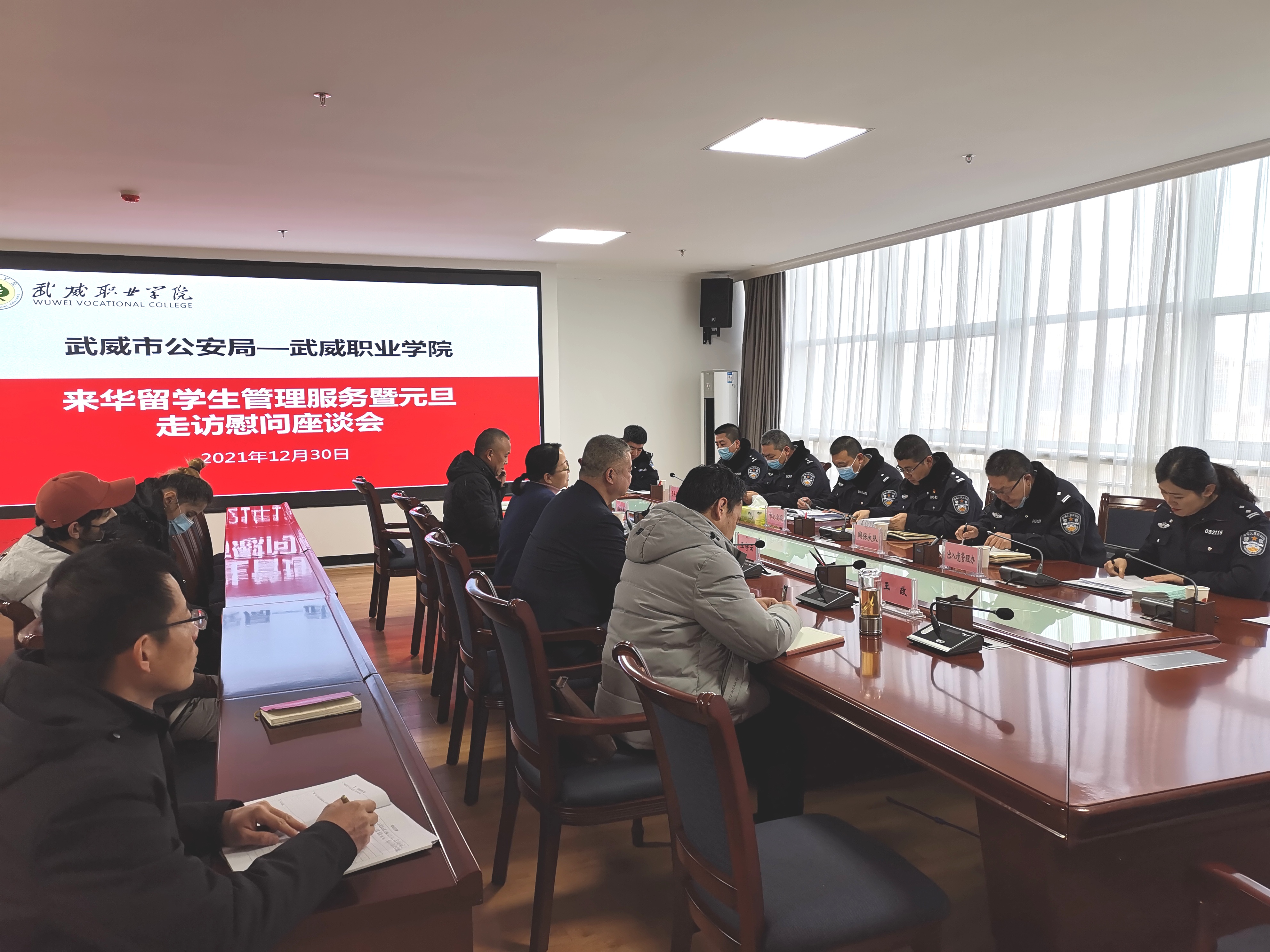 12月30日上午,市公安局出入境管理科、非政府組織管理辦公室,市公安局涼州分局國安大隊、反恐大隊、出入境管理辦公室、涼州分局西關(guān)街派出所一行十一人到訪學(xué)院,開展來華留學(xué)生管理服務(wù)暨元旦走訪慰問活動。黨委委員、副院長田迎春、王守云出席活動。國際合作與交流處處長潘從民、保衛(wèi)處處長王政及相關(guān)人員,2019級、2021級在華留學(xué)生參加活動。田迎春主持活動。