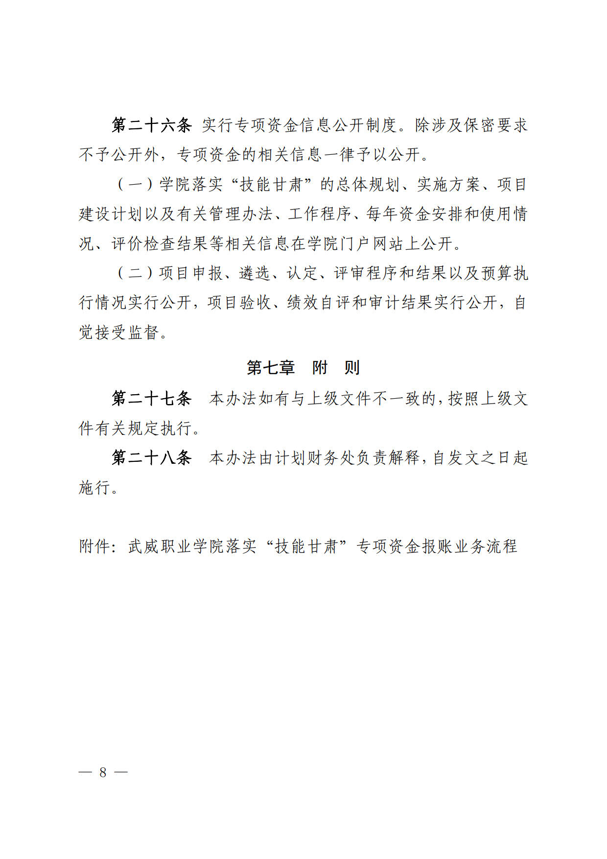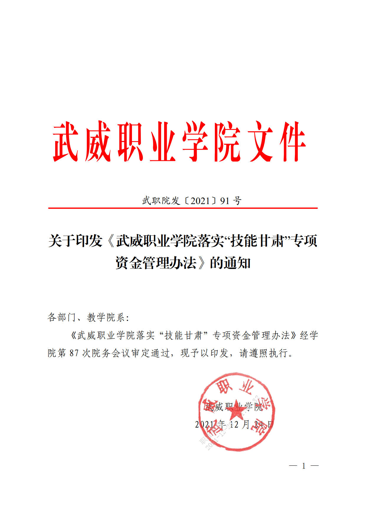 關(guān)于印發(fā)《武威職業(yè)學(xué)院落實(shí)“技能甘肅”專(zhuān)項(xiàng)資金管理辦法》的通知