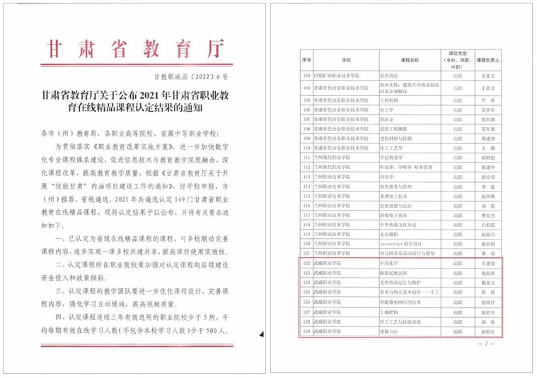藥學(xué)院王建強(qiáng)負(fù)責(zé)的《中藥化學(xué)》、經(jīng)濟(jì)管理學(xué)院張海燕負(fù)責(zé)的《隴原民族民俗》、中科低碳新能源技術(shù)學(xué)院魏顯文負(fù)責(zé)的《光伏電站運(yùn)行與維護(hù)》、張國祥負(fù)責(zé)的《智能微電網(wǎng)應(yīng)用技術(shù)》、藝術(shù)與教育學(xué)院薛媛負(fù)責(zé)的《美術(shù)與幼兒美術(shù)創(chuàng)作——手工》、現(xiàn)代農(nóng)業(yè)學(xué)院柴貴賢負(fù)責(zé)的《土壤肥料》、工程技術(shù)學(xué)院頡棟負(fù)責(zé)的《焊接工藝與技能訓(xùn)練》、趙特慶負(fù)責(zé)的《建筑CAD》8門課程獲評甘肅職業(yè)教育在線精品課程。