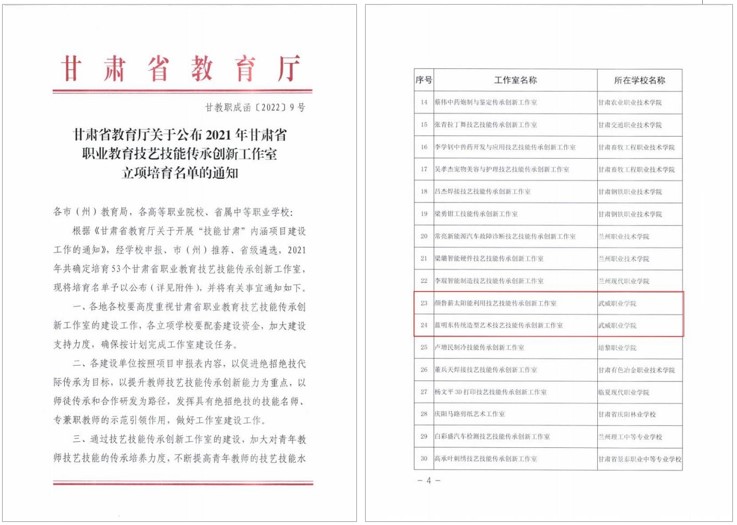 創(chuàng)新創(chuàng)業(yè)中心顏魯薪負(fù)責(zé)的“顏魯薪太陽能利用技藝技能傳承創(chuàng)新工作室”和藝術(shù)與教育學(xué)院藍(lán)明東負(fù)責(zé)的“藍(lán)明東傳統(tǒng)造型藝術(shù)技藝技能傳承創(chuàng)新工作室”獲評甘肅省職業(yè)教育技藝技能傳承創(chuàng)新工作室。