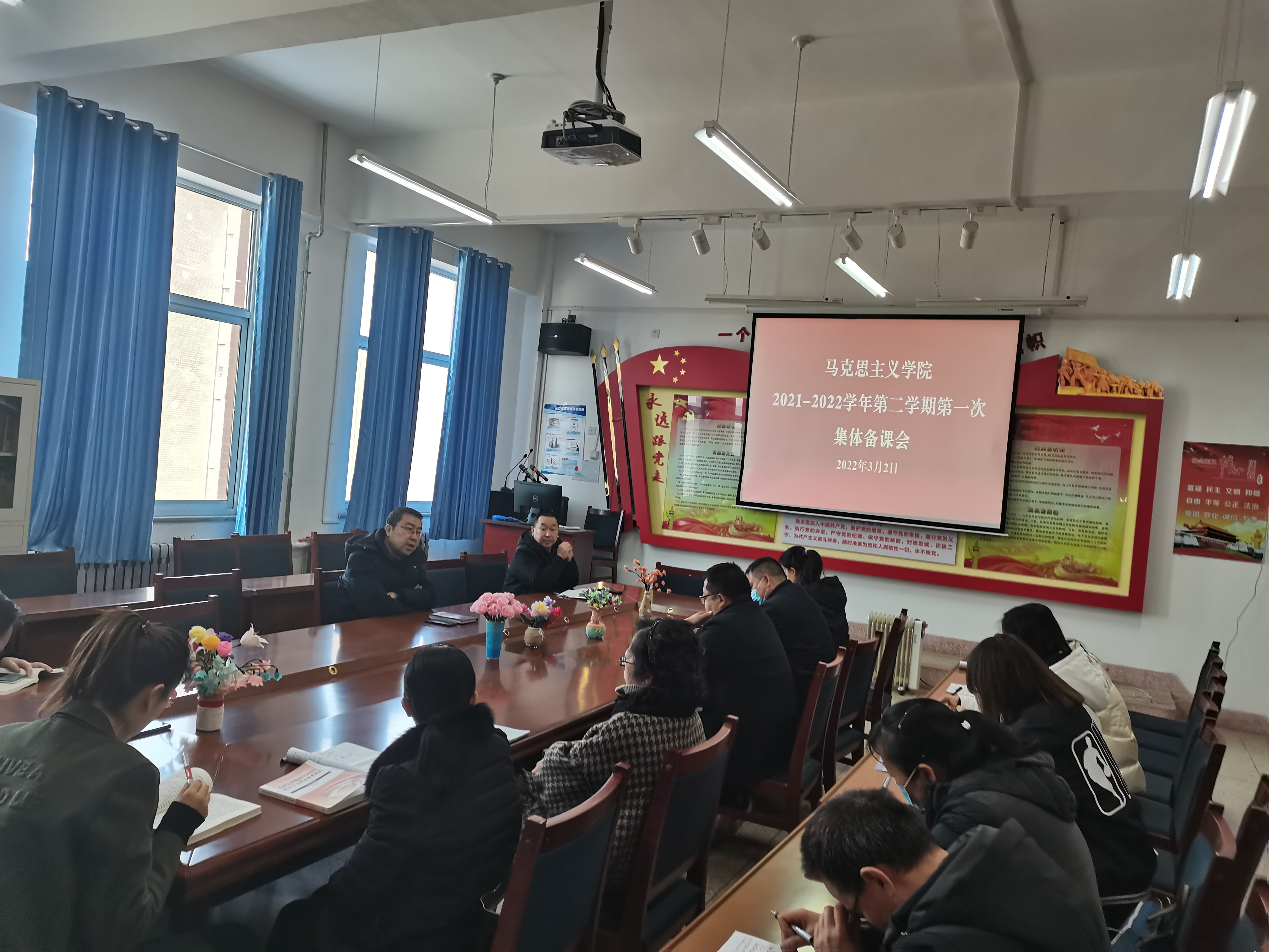 2022年正值習(xí)近平總書記3.18重要講話三周年,為貫徹落實(shí)學(xué)院黨委《關(guān)于做好習(xí)近平總書記在學(xué)校思政課教師座談會(huì)上重要講話精神貫徹落實(shí)情況全面總結(jié)宣傳工作的通知》精神,3月2日下午,馬克思主義學(xué)院在勵(lì)勤樓209會(huì)議室,召開學(xué)習(xí)貫徹習(xí)近平總書記在學(xué)校思政課教師座談會(huì)上重要講話精神學(xué)習(xí)總結(jié)備課會(huì)暨2021-2022學(xué)年第2學(xué)期《毛澤東思想和中國特色社會(huì)主義理論體系概論》課程教學(xué)集體備課會(huì),會(huì)議由馬克思主義學(xué)院院長胡靜峰主持,全體專兼職思政課教師參加了會(huì)議。