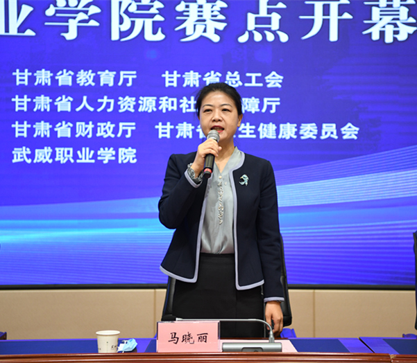 武威市教育局副局長馬曉麗宣布2022年全省職業(yè)院校技能大賽武威職業(yè)學院賽點開賽。