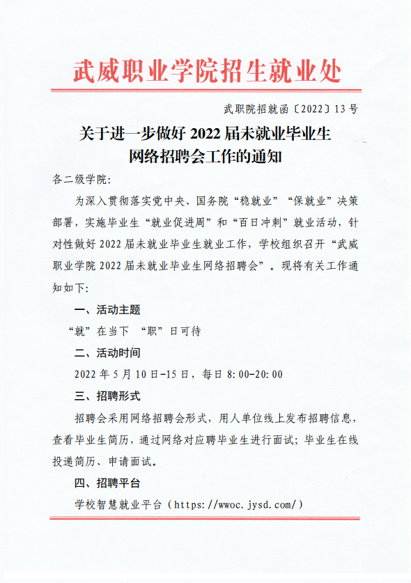 武威職業(yè)學(xué)院2022屆未就業(yè)畢業(yè)生就業(yè)促進(jìn)周暨網(wǎng)絡(luò)招聘會(huì)邀請(qǐng)函