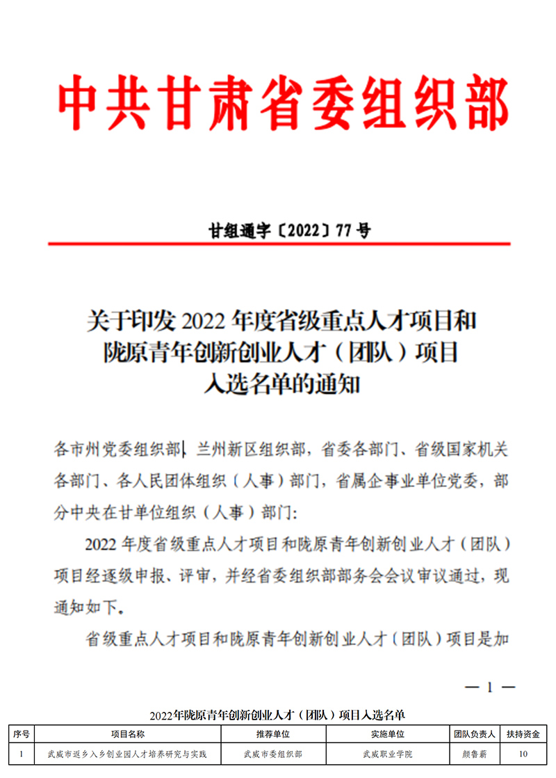 近日,省委組織部公布了2022年度省級重點人才項目和隴原青年創(chuàng)新創(chuàng)業(yè)人才(團(tuán)隊)項目入選名單,我校顏魯薪老師主持的《武威市返鄉(xiāng)入鄉(xiāng)創(chuàng)業(yè)園人才培養(yǎng)研究與實踐》獲隴原青年創(chuàng)新創(chuàng)業(yè)人才(團(tuán)隊)項目立項。
