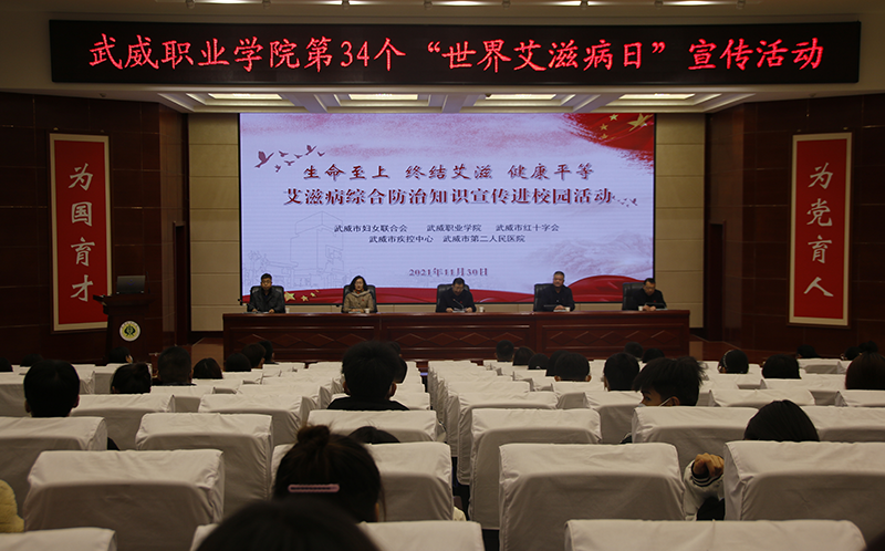 11月30日,學院在菁英廳開展了“生命至上 終結艾滋 健康平等”艾滋病綜合防治知識宣傳進校園活動。市疾控中心工會主席張富國、市婦聯(lián)副主席張惠華、學院黨委委員、副院長王守云,市第二人民醫(yī)院院長滕亮出席活動,活動由學院護理系黨總支書記張建輝主持,市紅十字會、市疾控中心、天馬行市民云數(shù)據(jù)有限公司工作人員及武威職業(yè)學院師生代表參加活動。