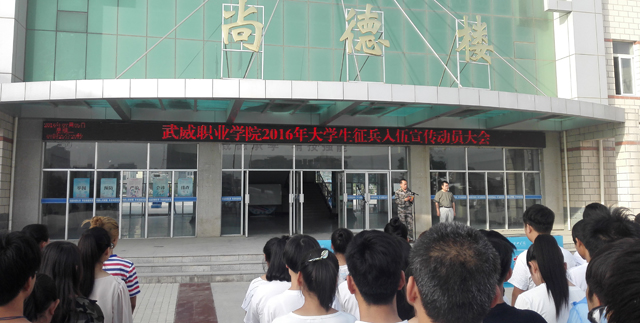 2016年7月5日早晨,學(xué)生工作處聯(lián)合院團(tuán)委在學(xué)院尚德樓北廣場舉行了“武威職業(yè)學(xué)院2016年大學(xué)生應(yīng)征入伍宣傳動員大會”。學(xué)院1000多名學(xué)生和各系輔導(dǎo)員參加了大會,學(xué)院武裝部部長王守云主持動員大會。