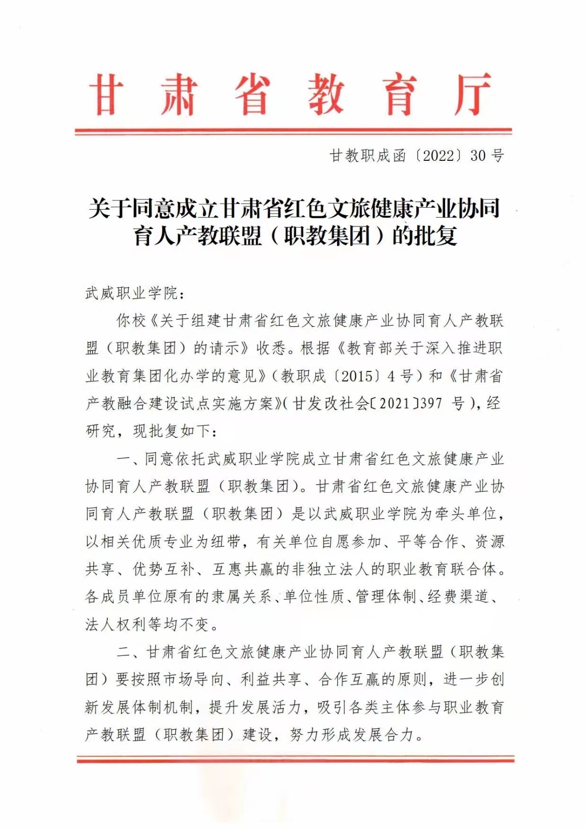 日前,甘肅省教育廳批復我校成立“甘肅省紅色文旅健康產(chǎn)業(yè)協(xié)同育人產(chǎn)教聯(lián)盟(職教集團)”。