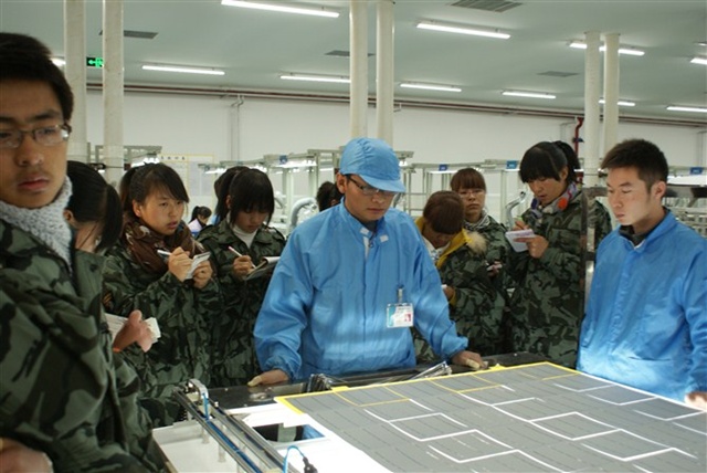 在校外實訓(xùn)過程中,由工藝部楊經(jīng)理和工藝部文工程師給大家介紹公司情況、公司管理規(guī)范,并帶領(lǐng)大家進行參觀,給學(xué)生詳細講解整個光伏產(chǎn)業(yè)鏈,包括硅片的生產(chǎn)、電池片的生產(chǎn)和太陽能電池組件的生產(chǎn),重點是光伏組件的生產(chǎn)。實訓(xùn)期間由工廠師傅帶領(lǐng)學(xué)生在車間分組進行實訓(xùn)。依據(jù)光伏組件生產(chǎn)工作流程實訓(xùn)內(nèi)容分為前道工序和后道工序,前道工序包括:電池片篩選、單焊、串焊、疊層、初檢、EL1測試和層壓;后道工序包括:削邊、裝邊框、裝接線盒、清洗、EL2測試、功率測試、終檢和包裝入庫。同學(xué)們通過親身體驗和輪崗學(xué)習(xí),熟悉了光伏組件的每一道生產(chǎn)工序,對光伏組件的整個生產(chǎn)過程有了一個更加清晰的認識和了解。