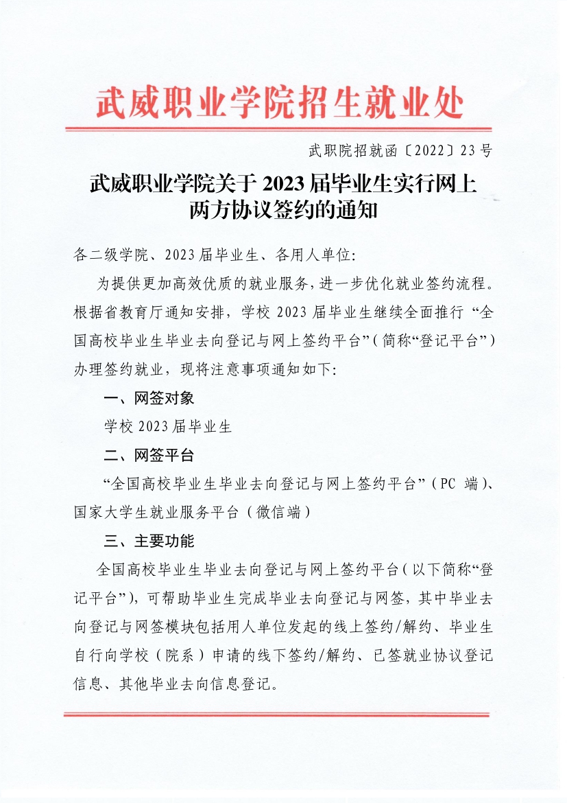 武威職業(yè)學(xué)院關(guān)于2023屆畢業(yè)生實(shí)行網(wǎng)上兩方協(xié)議簽約的通知