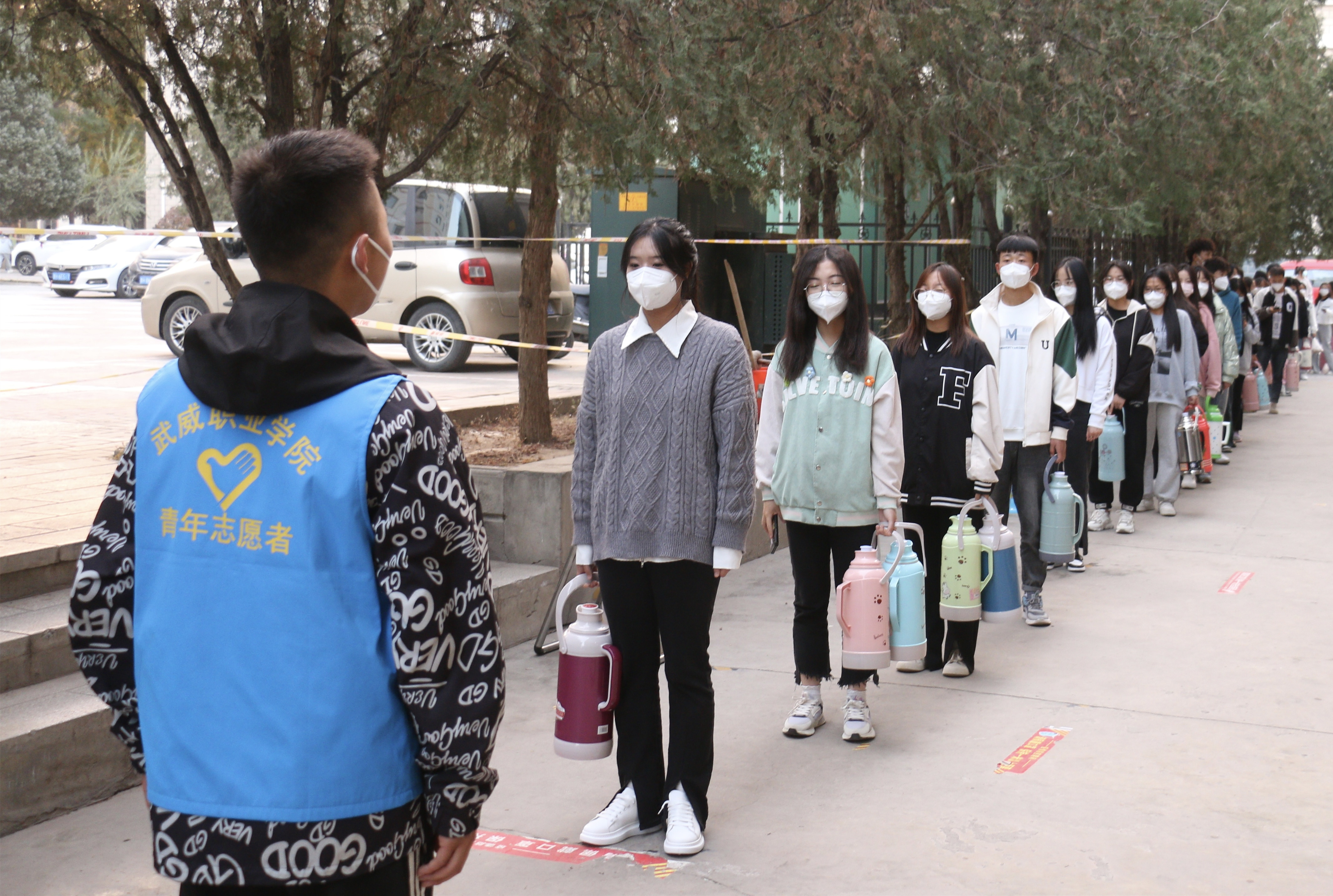 從學校實行最小單元宿舍管理開始,各學生組織工作人員分批次、不間斷、輪流值守,他們主動亮身份、帶頭當先鋒,在校園食堂、水房、超市等人流容易聚集的地方,每天安排志愿者在人流高峰時間段排班站崗,勸導同學們遵守疫情防控一米線,不扎堆不聚集,積極佩戴好口罩,做好個人防護工作,確保同學們吃飯、購物、打水健康有序進行。在對可能傳入疫情的校園圍欄處開展值守勸阻工作,積極勸導學生不購買社會面商品,堅決杜絕疫情從社會傳入校園,將學校疫情防控各項措施落細落實,切實扛起校園疫情防控責任。一件件“藍馬甲”活躍在校園每個角落,服務同學的身影從未間斷,成為校園里一道靚麗的風景線,用實際行動詮釋了新時代武職學子的責任與擔當。