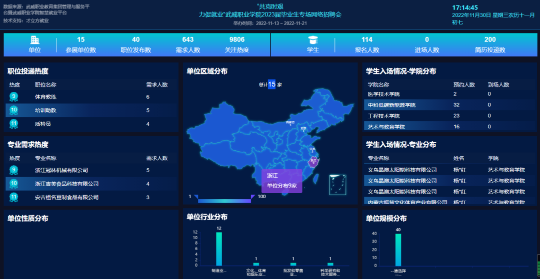 本次云聘系列活動分兩個階段舉行,第一階段為“共克時艱力促就業(yè)”武威職業(yè)學(xué)院2023屆畢業(yè)生專場網(wǎng)絡(luò)招聘會,于11月7日至11月21日舉行。本次招聘會主要面向在疫情條件下,能夠?qū)\嚱舆\學(xué)生赴企業(yè)就業(yè)的單位。湖州市安吉縣人力資源和社會保障局組織10余家當?shù)仄髽I(yè)參加了本次招聘會,同時吸引內(nèi)蒙古靈圣作物科技有限公司、江蘇京東信息技術(shù)有限公司、義烏晶澳太陽能科技有限公司、內(nèi)蒙古振慧文化體育產(chǎn)業(yè)有限公司等企業(yè)參加,提供招聘職位40個,需求人數(shù)643人,招聘會關(guān)注人次達9806,200余人投遞簡歷。