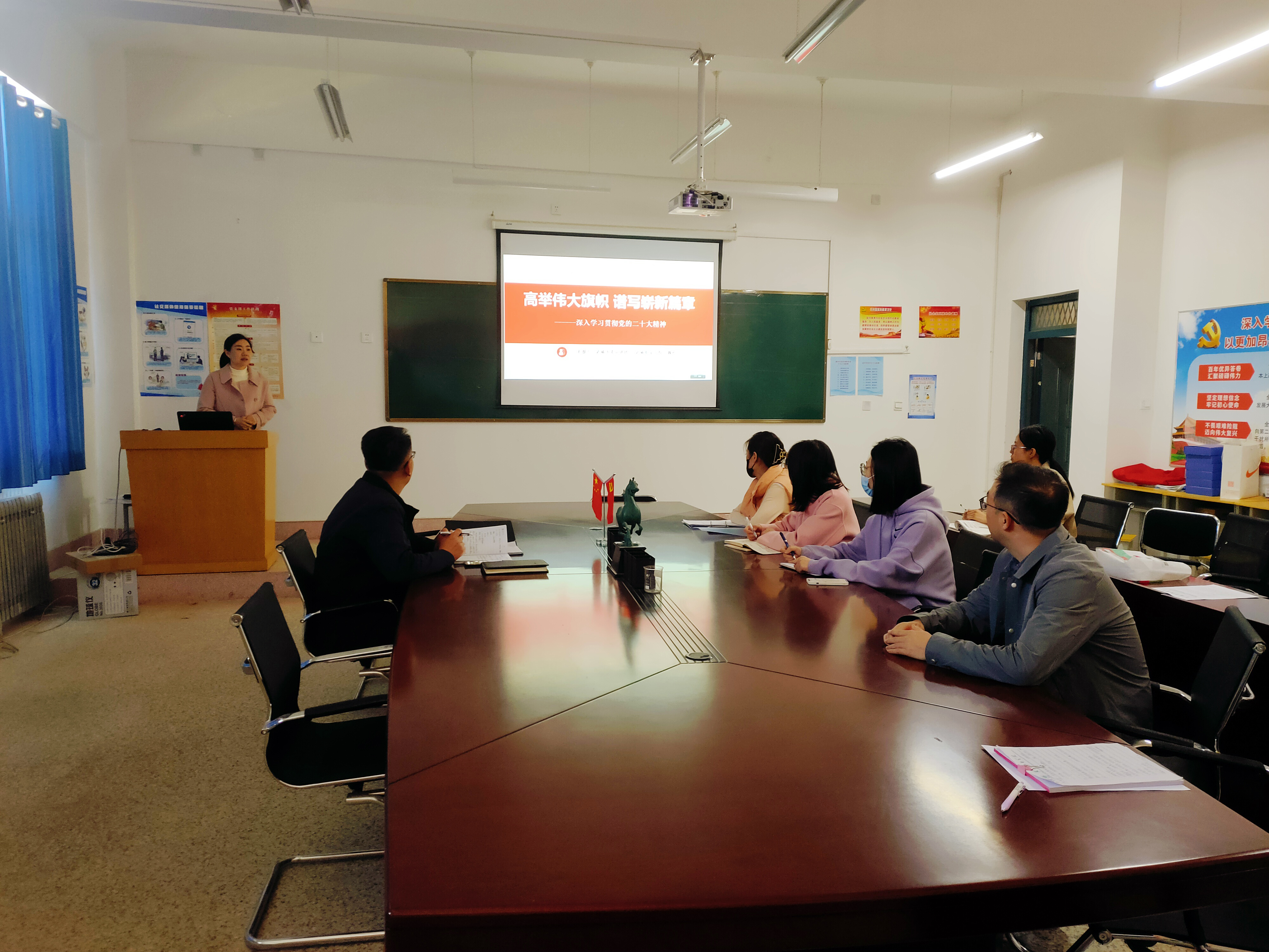 魏玲緊緊圍繞大會主題、主要成果、“新時代的偉大變革:取得歷史性成就和發(fā)生歷史性變革”“新時代的思想指引: 開辟馬克思主義中國化時代化的新境界”“新時代的使命任務:以中國式現(xiàn)代化全面推進中華民族偉大復興”“新時代的戰(zhàn)略舉措: 以頑強斗爭打開偉大事業(yè)發(fā)展新天地”“新時代的根本保證:堅定不移全面從嚴治黨”等主要內(nèi)容進行了深入闡述和講解。全面解析黨的二十大精神,勉勵全體黨員教師要勇敢面對難題,穩(wěn)步提升教學質量,為新時代高質量教育發(fā)展奮斗。