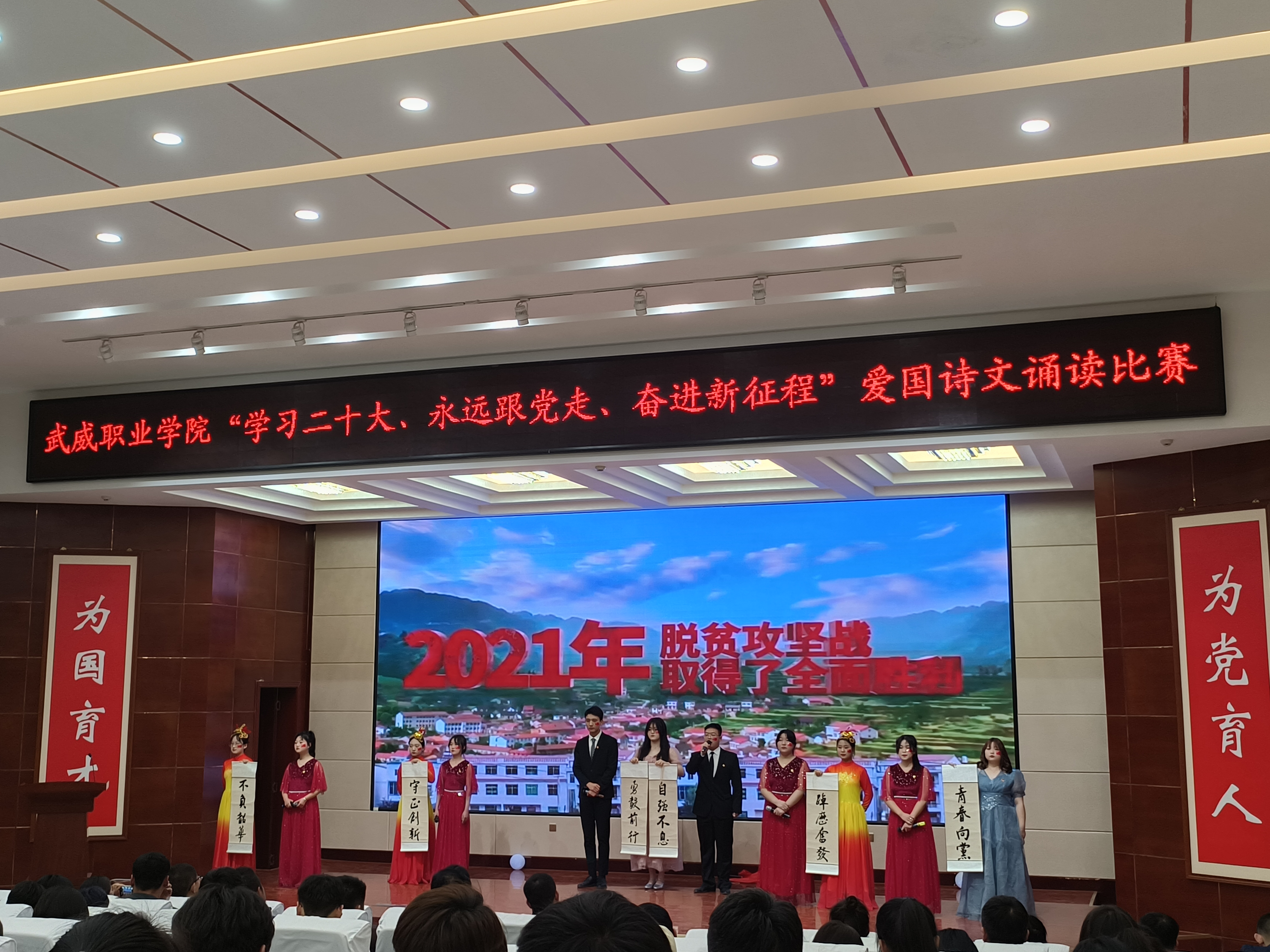 2023年4月20日,藥學(xué)院參加武威職業(yè)學(xué)院以“學(xué)習(xí)二十大 永遠(yuǎn)跟黨走 奮進(jìn)新征程”愛國(guó)詩文誦讀比賽由校團(tuán)委牽頭在箐英廳舉行愛國(guó)詩文誦讀比賽決賽。邀請(qǐng)到了五位評(píng)委老師,現(xiàn)場(chǎng)氛圍如火如荼,所有在場(chǎng)的老師同學(xué)都懷有期待迎來了比賽的開始。
