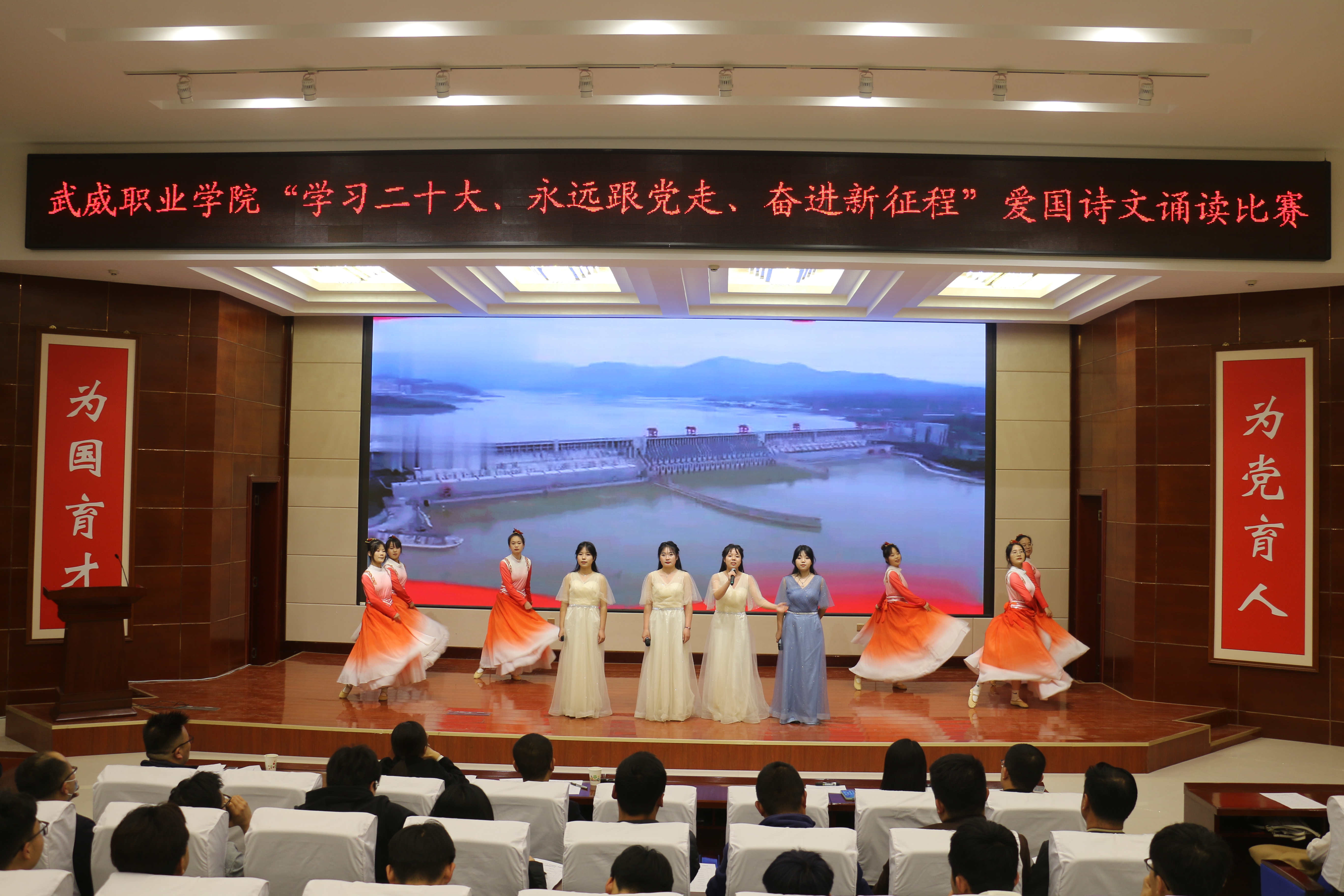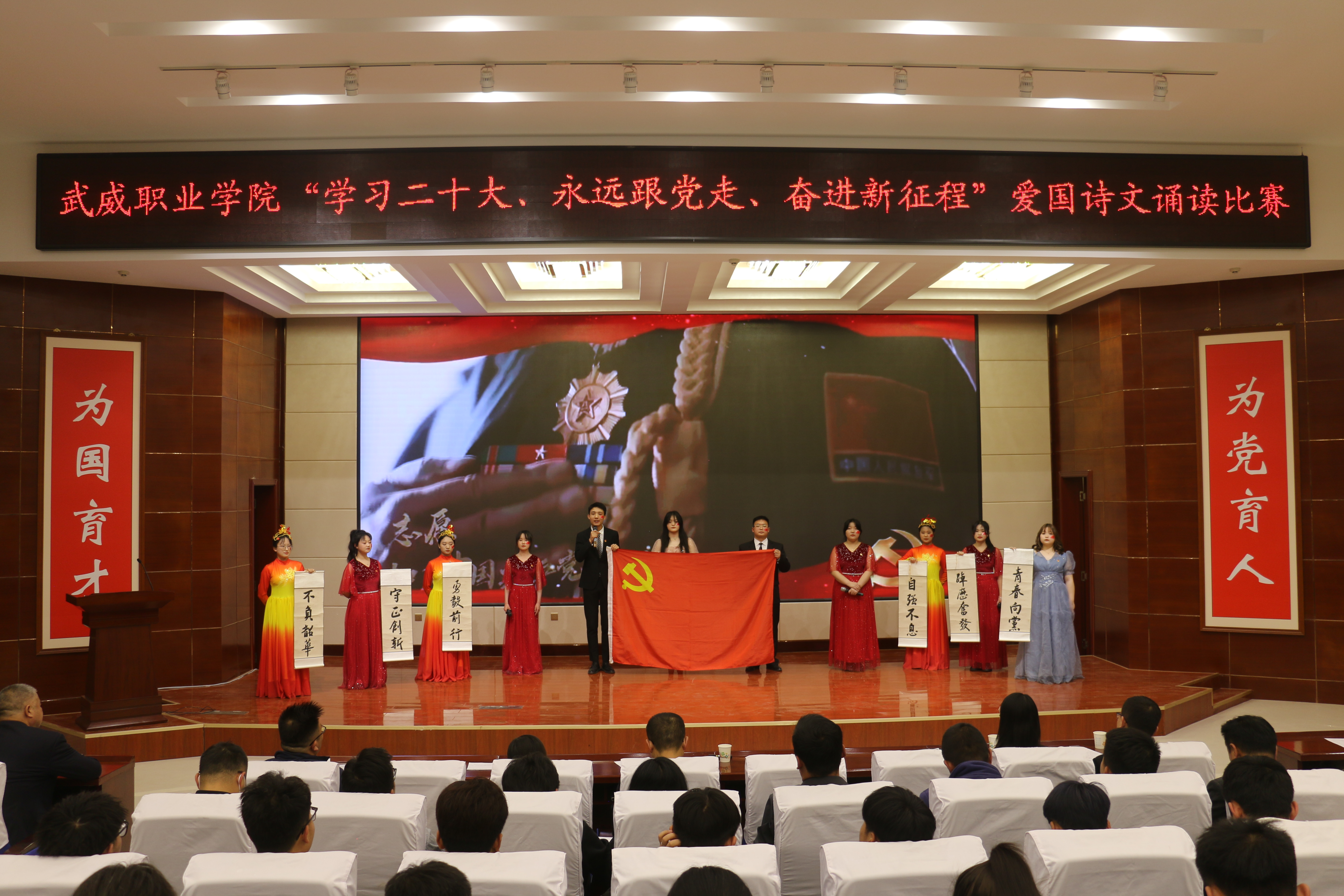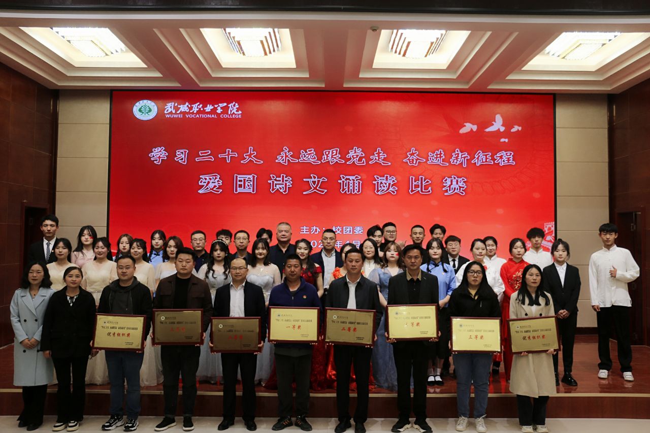大賽于3月啟動,歷時一個月,各二級學院經過初賽評比推選出9個優(yōu)秀節(jié)目入圍決賽。比賽現(xiàn)場,各參賽隊以“學習二十大、永遠跟黨走、奮進新征程”為主題,將傳承經典詩文和弘揚愛國主義精神結合,誦詩抒情、借詞言志,熱情謳歌中國共產黨不懈奮斗的光輝歷程,全面展現(xiàn)新時代青年以夢為馬,不負韶華的青春風貌。校團委原創(chuàng)編排表演的節(jié)目《追夢八步沙,奮斗正青春》,深情動人,感染全場,歌頌了“六老漢”矢志艱苦奮斗的隴人品格,抒發(fā)了當代青年永跟黨走,青春建功的豪情壯志。富余藝術感染力的經典吟誦,穿插舞蹈、劇情和紅歌演唱,為廣大師生呈現(xiàn)了一場視聽盛宴。