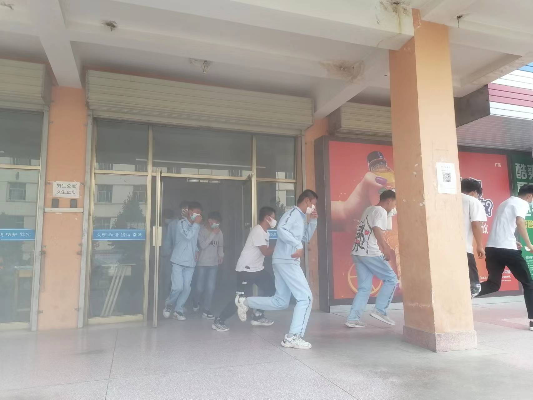 15時20分,疏散演練正式開始。隨著火災(zāi)警報響起,安全保衛(wèi)工作人員點(diǎn)燃煙餅,在學(xué)生公寓樓模擬火災(zāi)現(xiàn)場,冒出滾滾濃煙,公寓管理人員迅速組織學(xué)生有序疏散。在輔導(dǎo)員、班主任的引導(dǎo)下,同學(xué)們按照動作要領(lǐng),用濕毛巾捂住口鼻,俯身彎腰按照安全出口指示牌快速、有序從疏散通道撤離到體育場,整個過程緊張有序,實(shí)用性強(qiáng),達(dá)到了預(yù)期效果。