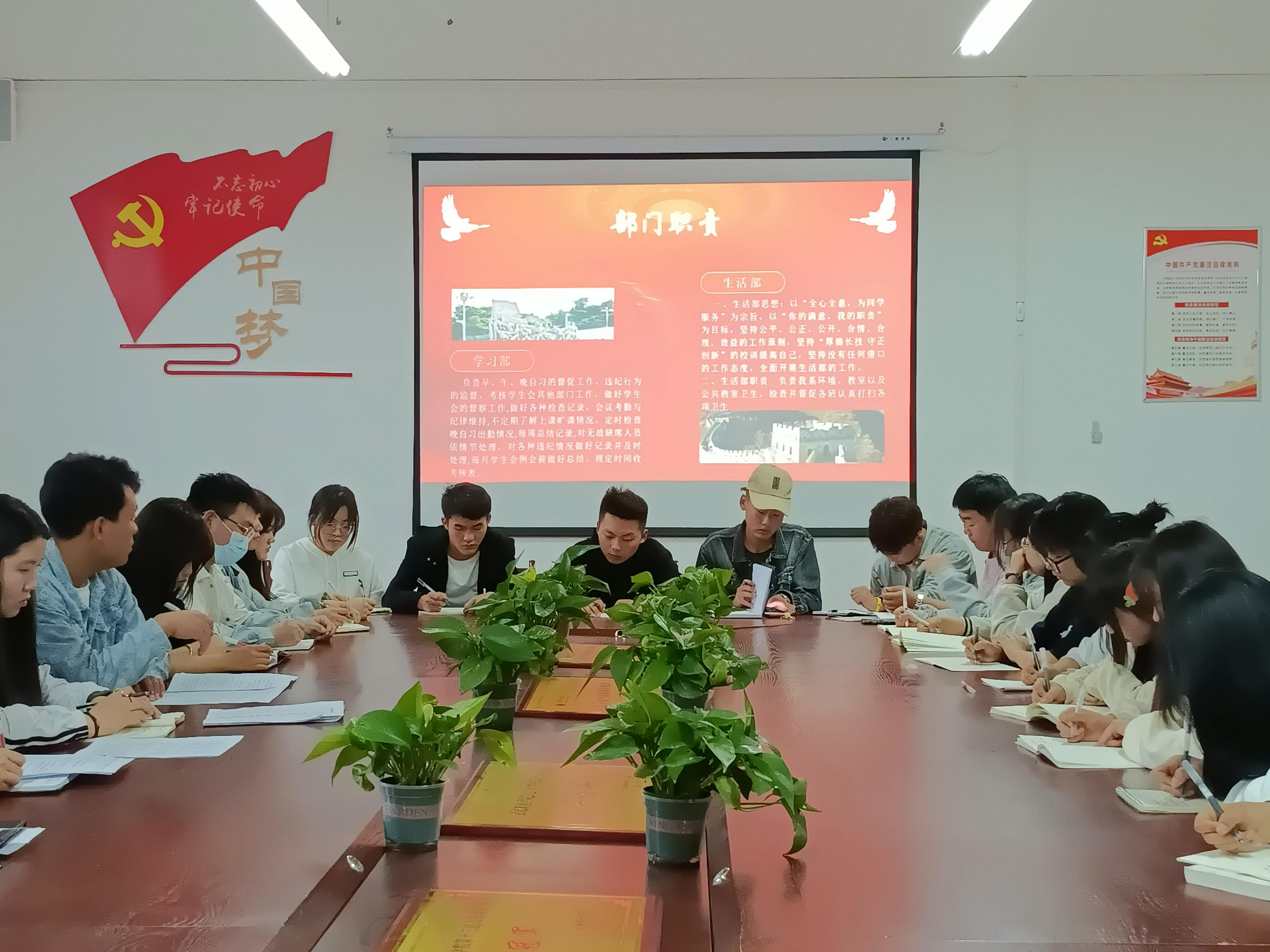 ? ? ? ? ??? ? ? ?會(huì)議第二項(xiàng)由胡瑞琪講述學(xué)生例會(huì)制度,為了更好的服務(wù)同學(xué),每次例會(huì)都會(huì)實(shí)行考勤制度,由各部長向主席團(tuán)匯報(bào)本周的工作情況,再由主席團(tuán)向輔導(dǎo)員匯報(bào)本周問題,并安排下周工作。接著我院主席團(tuán)成員尚寶萍表達(dá)了對(duì)團(tuán)學(xué)工作的充分肯定和支持,同時(shí)也提出了幾點(diǎn)工作的不足。各部門部長也更加詳細(xì)的對(duì)工作內(nèi)容進(jìn)行了的介紹。??