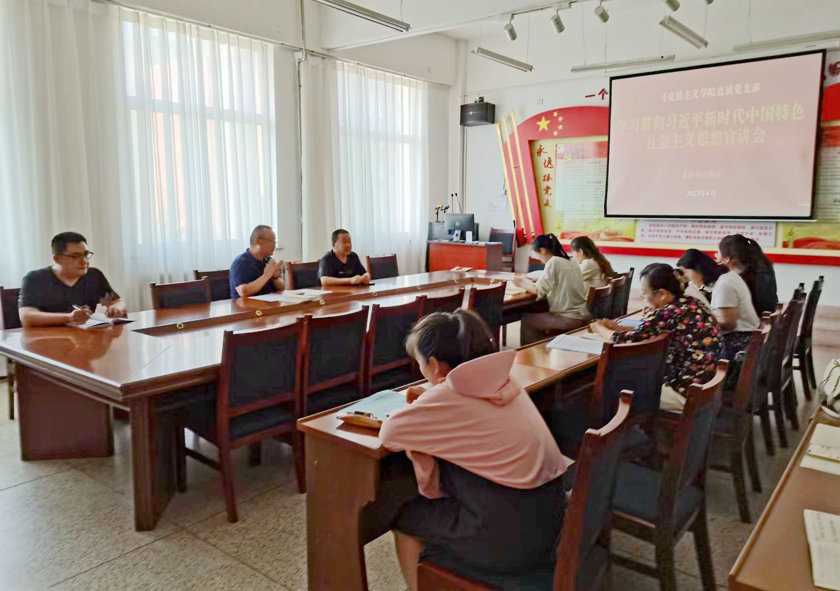 為推動學(xué)習(xí)貫徹習(xí)近平新時(shí)代中國特色社會主義思想主題教育走深走實(shí),教育引導(dǎo)教師全面學(xué)習(xí)、深刻領(lǐng)會、準(zhǔn)確把握習(xí)近平新時(shí)代中國特色社會主義思想,按照學(xué)校宣講工作部署,6月29日,馬克思主義學(xué)院黨支部開展了學(xué)習(xí)貫徹習(xí)近平新時(shí)代中國特色社會主義思想主題教育專題宣講活動,黨支部書記劉心作宣講,支部全體黨員參加活動。
