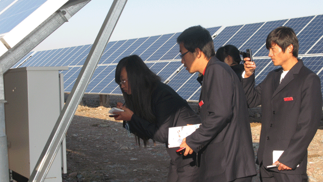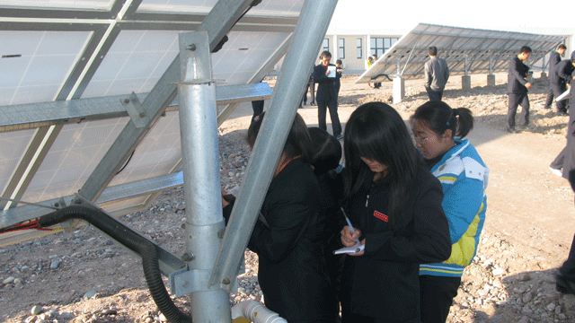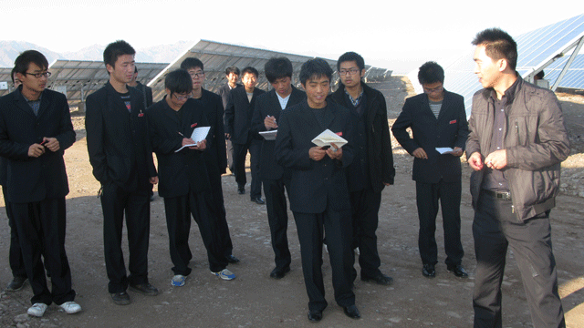 在觀摩學(xué)習(xí)過程中,全體師生受到了園區(qū)管委會工作人員的熱情接待,管委會張國偉主任帶領(lǐng)師生參觀了中節(jié)能甘肅武威太陽能發(fā)電有限公司,公司負(fù)責(zé)人向大家介紹了園區(qū)建設(shè)情況,從多晶硅、單晶硅的提煉、太陽能電池板的生產(chǎn)制造到光伏電站的建設(shè),對光伏發(fā)電產(chǎn)業(yè)鏈進(jìn)行了較詳盡的講述。同學(xué)們看到園區(qū)內(nèi)一排排整齊擺置的太陽能電池板方陣時,都流露出激動崇敬的神情,一個個邊走邊看,并伸手觸摸太陽能電池板。同學(xué)們就光伏發(fā)電的原理、電池使用壽命、光電轉(zhuǎn)換效率以及光伏電站的運(yùn)行維護(hù)等方面的專業(yè)知識向負(fù)責(zé)人請教,面對大家的疑問,園區(qū)負(fù)責(zé)人都耐心細(xì)致的做了解答。