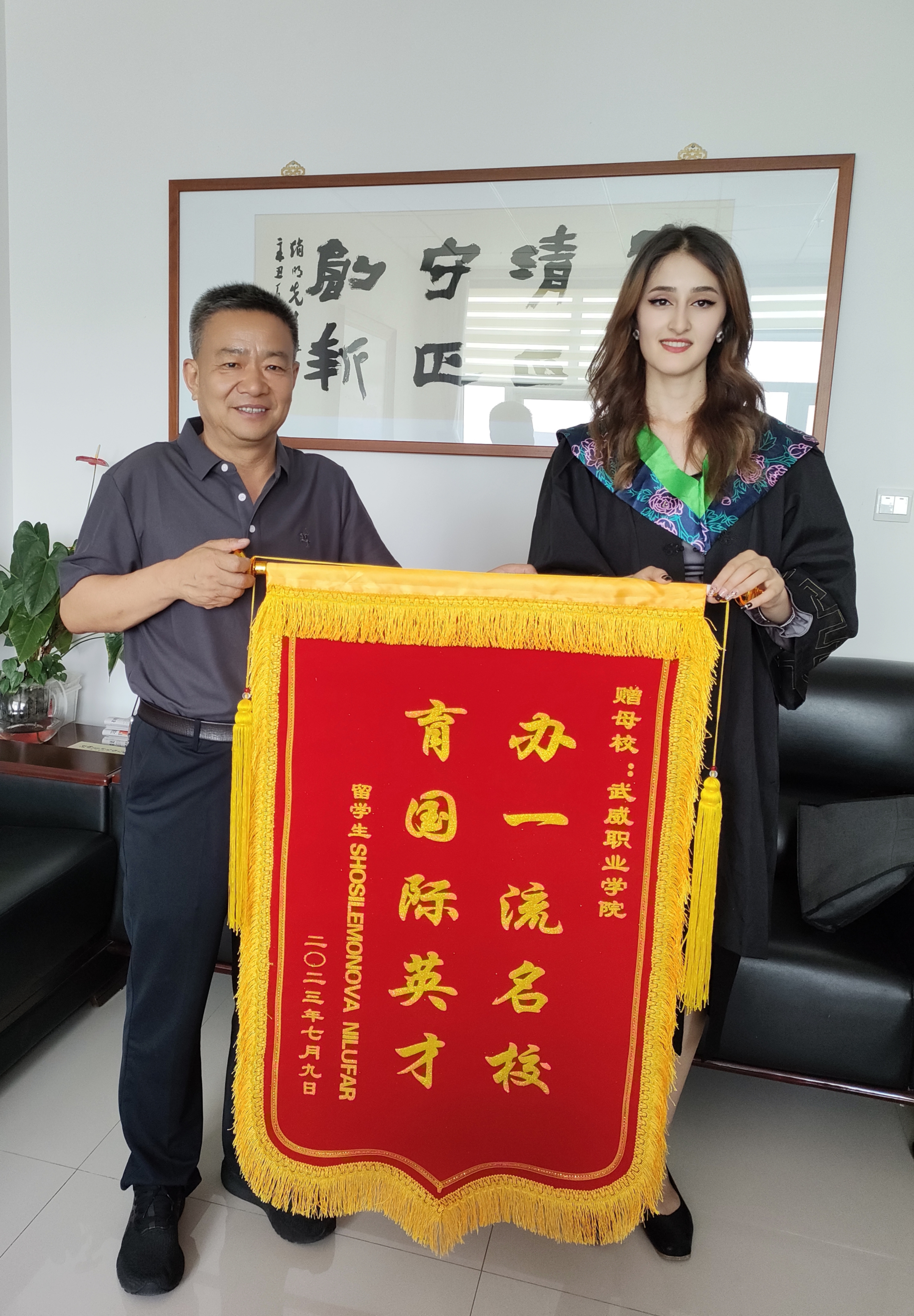 國際學生HOSILEMONOVA NILUFAR(妮娜)向?qū)W校贈送“辦一流名校 育國際英才”的感謝旌旗,對學校精心、悉心培養(yǎng)自己表達了由衷的感謝,表示在武威職業(yè)學院收獲了專業(yè)技能和人生閱歷,接觸到了先進技術(shù)技能和前沿思想,特別是通過學習中國文化,深刻認識到文化交流的重要性,也更加堅定了自己繼續(xù)學習中文和中國文化的決心。