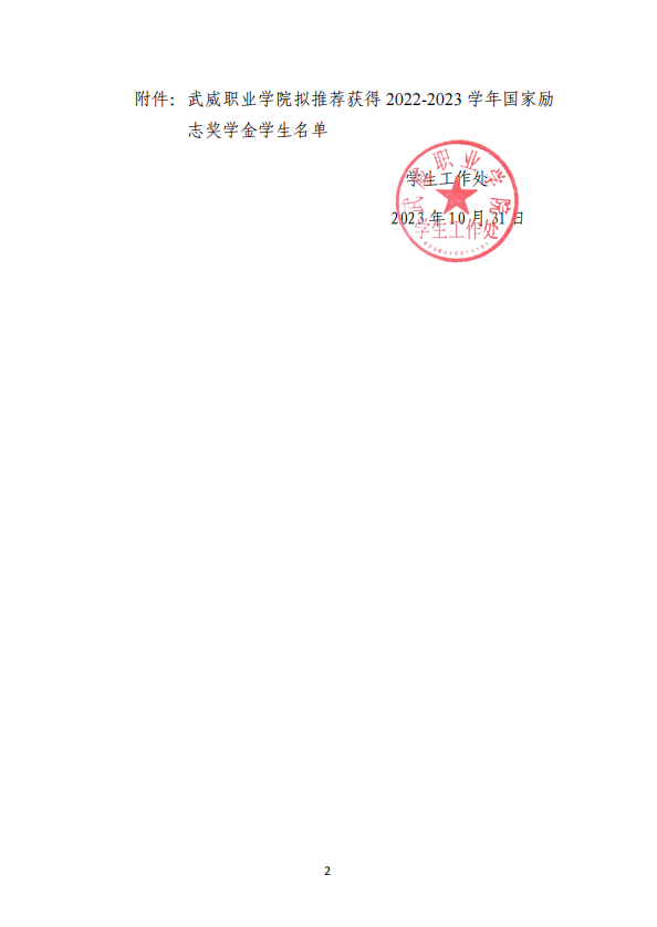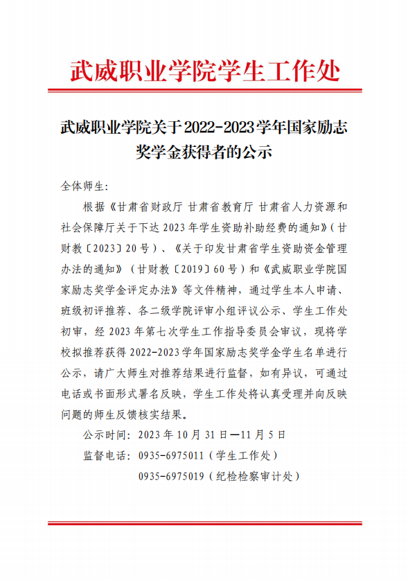 武威職業(yè)學(xué)院關(guān)于2022-2023學(xué)年國(guó)家勵(lì)志獎(jiǎng)學(xué)金候選人的公示
