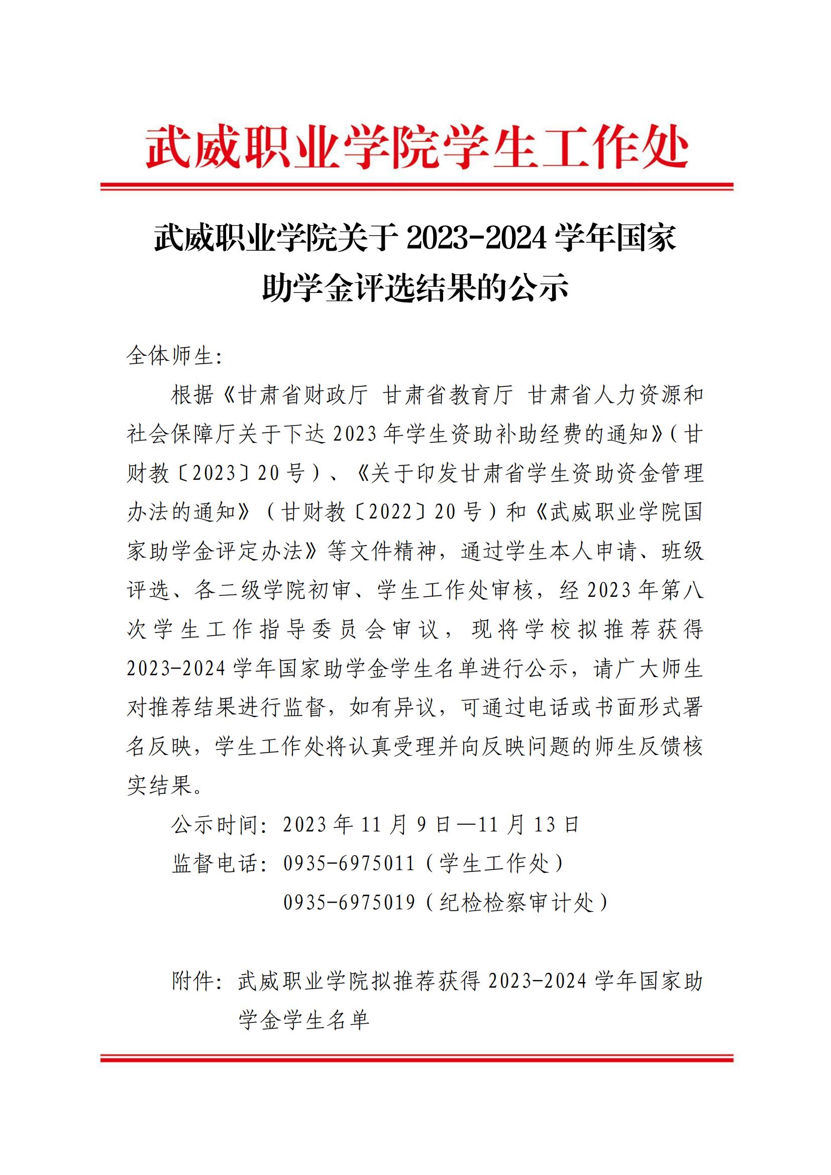 武威職業(yè)學(xué)院關(guān)于2023-2024學(xué)年國家助學(xué)金評(píng)選結(jié)果的公示