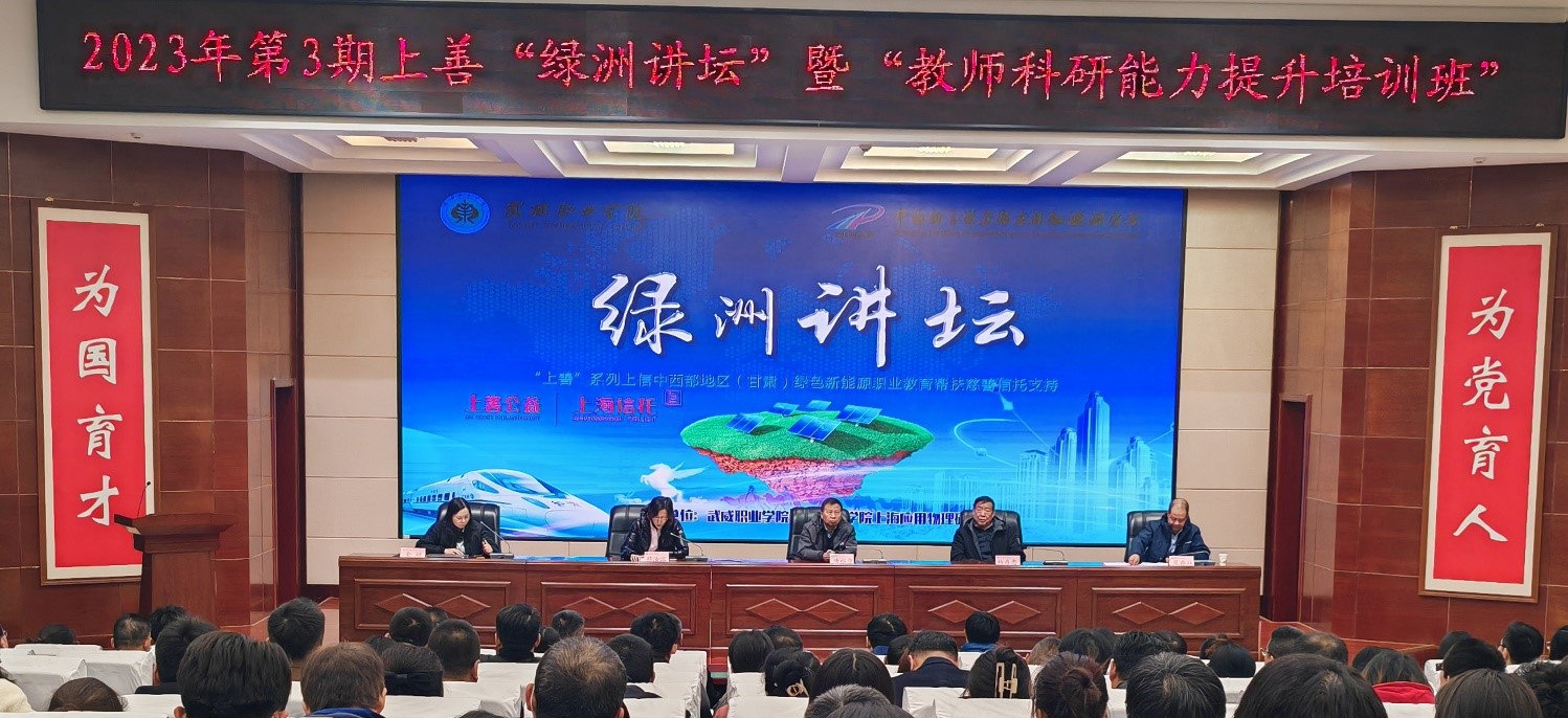 蔡汝溶在致辭中表示,很高興能受邀參加此次“綠洲講壇”,上?!吧仙啤贝壬菩磐信c武威職業(yè)學(xué)院結(jié)緣于2021年,期間已開(kāi)展多次綠色新能源職業(yè)教育教師培訓(xùn)和學(xué)生頂崗實(shí)習(xí)引導(dǎo)活動(dòng),本次系列活動(dòng)面向武威職業(yè)學(xué)院及武威中小學(xué)開(kāi)展系列新能源科普講座活動(dòng),宣傳國(guó)家雙碳與能源安全戰(zhàn)略,不斷擴(kuò)大公益的受益面,用上海的研究?jī)?yōu)勢(shì)服務(wù)西部綠色新能源發(fā)展,積極響應(yīng)國(guó)家科技大發(fā)展戰(zhàn)略,助力國(guó)家產(chǎn)業(yè)結(jié)構(gòu)的調(diào)整和雙碳目標(biāo)的實(shí)現(xiàn),服務(wù)甘肅區(qū)域經(jīng)濟(jì)發(fā)展。