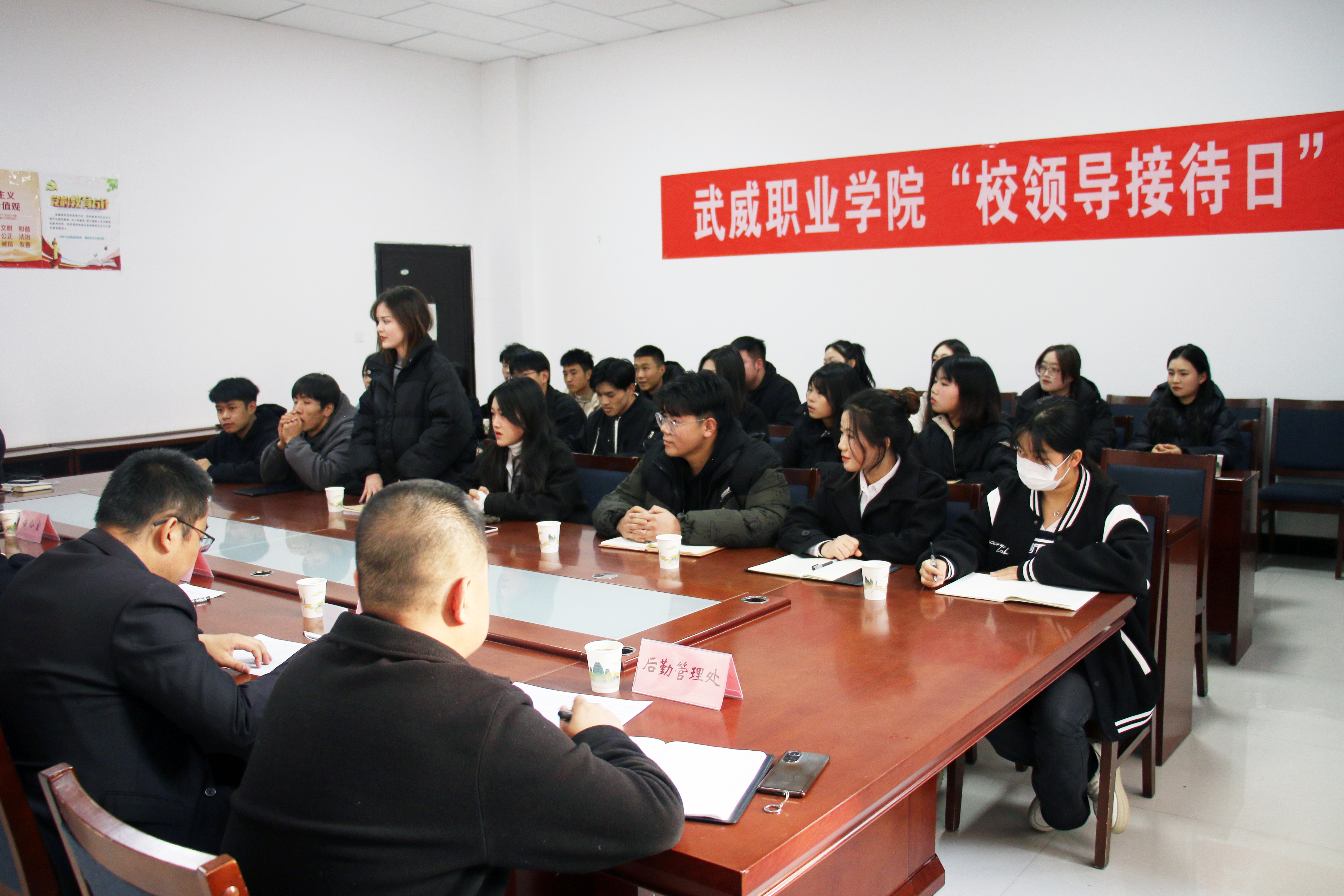 為切實做好“四下基層”工作,保障學生權益,進一步營造民主和諧的校園氛圍,提高校園服務質(zhì)量和管理水平,學校于11月24日下午在學生發(fā)展中心103會議室舉辦了2023-2024學年第一期“校領導接待日”活動。校長、黨委副書記張開禮與來自各二級學院的22名學生代表進行了親切交流,辦公室、教務處、學生工作處、后勤管理處等相關部門負責人參加了活動。