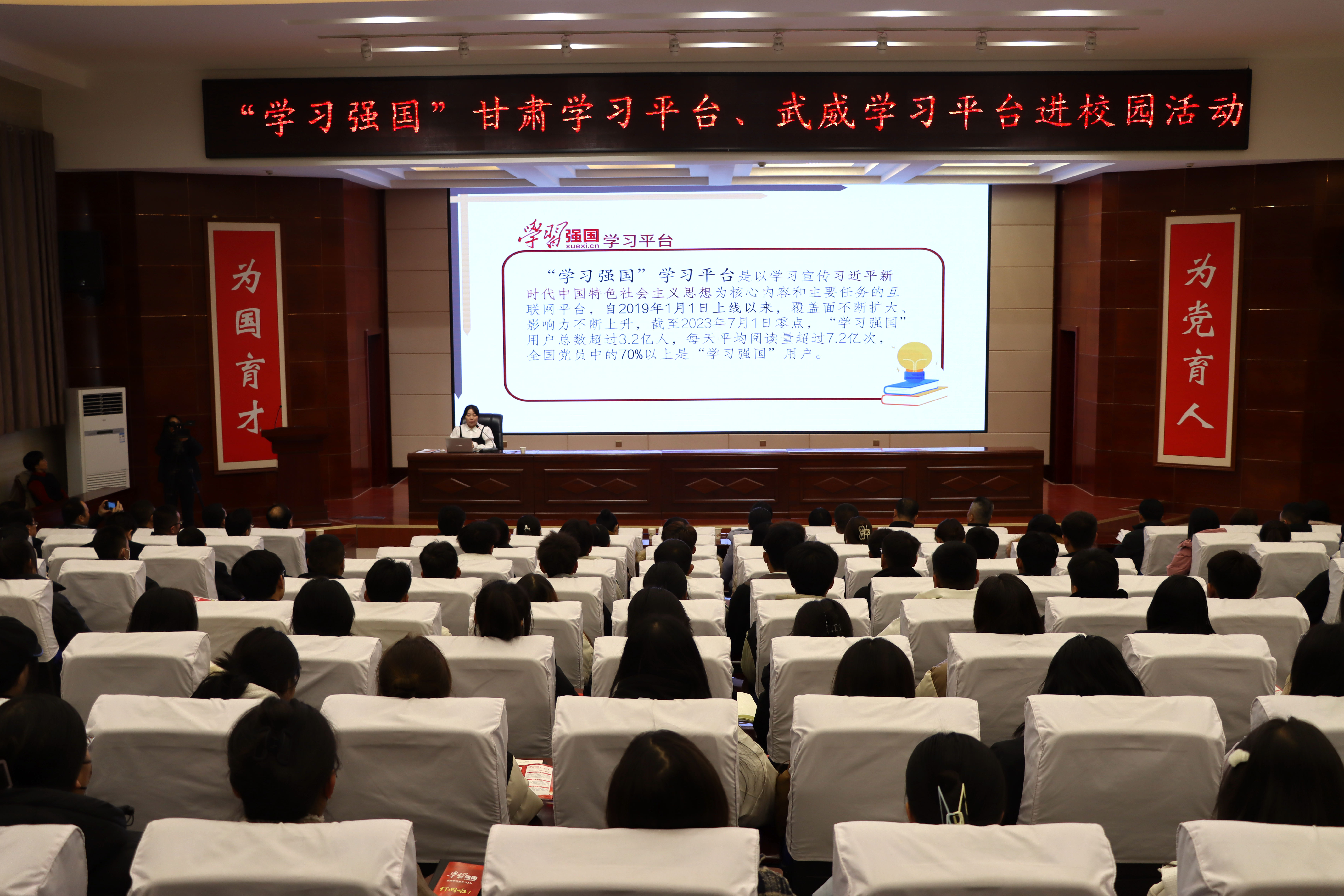 11月28日下午,“學(xué)習(xí)強(qiáng)國(guó)”甘肅學(xué)習(xí)平臺(tái)、武威學(xué)習(xí)平臺(tái)進(jìn)校園活動(dòng)在學(xué)校菁英廳舉辦,省委講師團(tuán)副團(tuán)長(zhǎng)張啟曄、市委講師團(tuán)團(tuán)長(zhǎng)蔡生菊出席了活動(dòng),活動(dòng)由學(xué)校黨委委員、副校長(zhǎng)何毅主持。