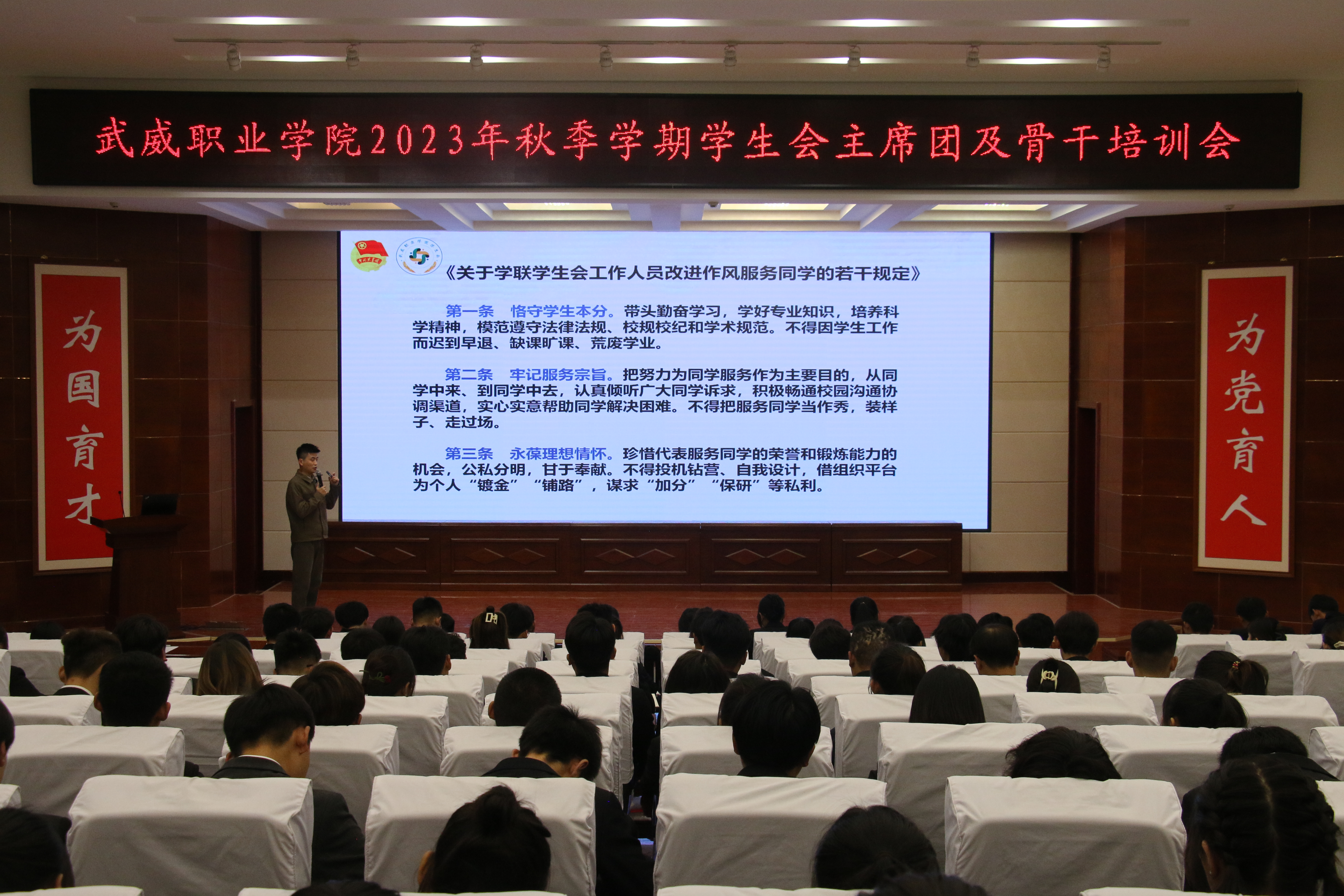 校學(xué)生會主席團成員帶頭領(lǐng)學(xué)了《關(guān)于學(xué)聯(lián)學(xué)生會工作人員改進作風(fēng)服務(wù)同學(xué)的若干規(guī)定》《武威職業(yè)學(xué)院學(xué)生會章程》等制度文件。學(xué)生會秘書長張登海以《微光凝聚星海,筑夢情懷方舟》為題,圍繞加強思想政治建設(shè)、深化學(xué)生會組織改革和進一步加強從嚴(yán)治會等方面,為學(xué)生會組織成員展開培訓(xùn)。