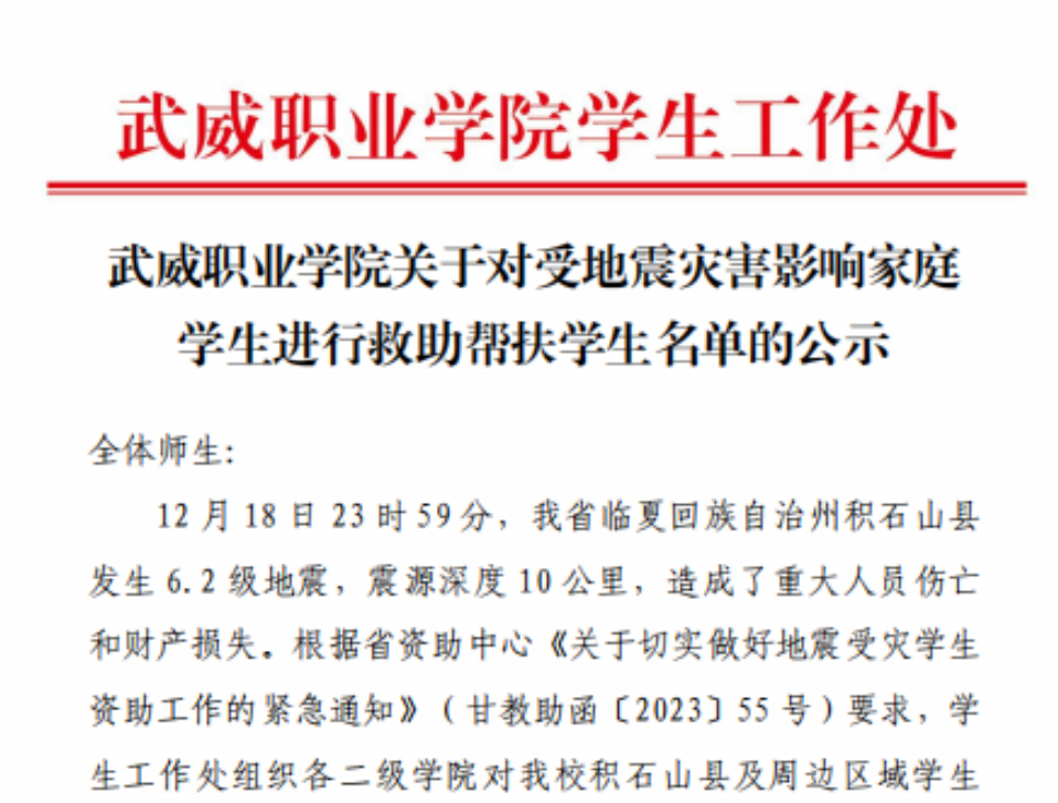 12月18日23時(shí)59分,我省臨夏回族自治州積石山縣發(fā)生6.2級(jí)地震。地震發(fā)生后,學(xué)校高度重視災(zāi)區(qū)學(xué)生家庭受災(zāi)情況,密切關(guān)注各項(xiàng)災(zāi)情的發(fā)展變化,第一時(shí)間對(duì)積石山縣及周邊區(qū)域地震受災(zāi)家庭學(xué)生情況進(jìn)行摸排,迅速啟動(dòng)救助幫扶關(guān)愛(ài)工作。