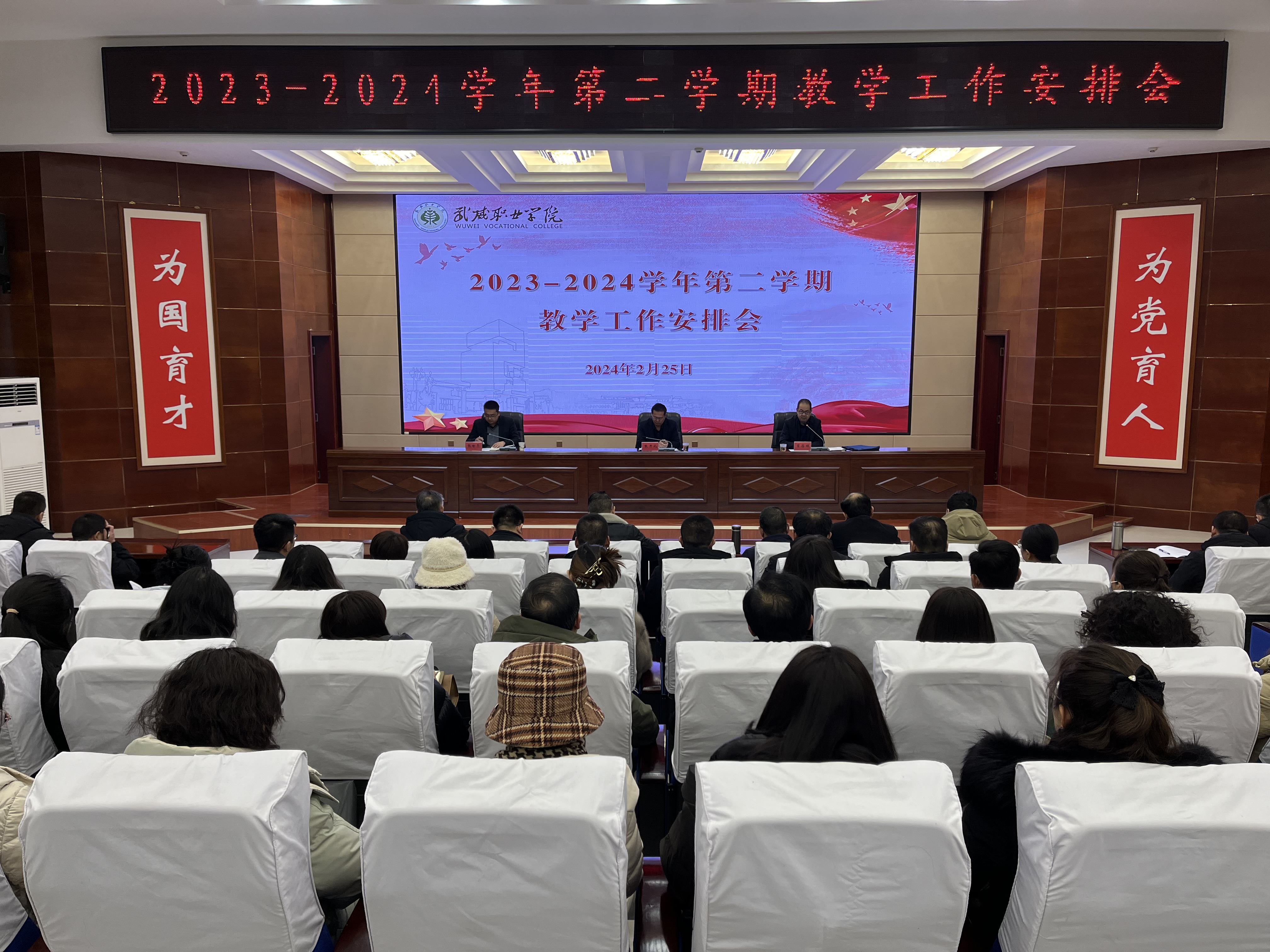 為持續(xù)推動教學(xué)運行與管理規(guī)范化、標(biāo)準(zhǔn)化、科學(xué)化,進一步提升新學(xué)期教學(xué)工作成效和人才培養(yǎng)質(zhì)量,扎實推進學(xué)校高質(zhì)量建設(shè),2月25日上午,學(xué)校在菁英廳組織召開了2023-2024學(xué)年第二學(xué)期教學(xué)工作安排會。學(xué)校校長、黨委副書記張開禮、黨委副書記翟存祥、各二級學(xué)院負(fù)責(zé)人、教學(xué)秘書、教研室主任、各專業(yè)帶頭人和教務(wù)處全體工作人員參加了會議。會議由翟存祥主持。