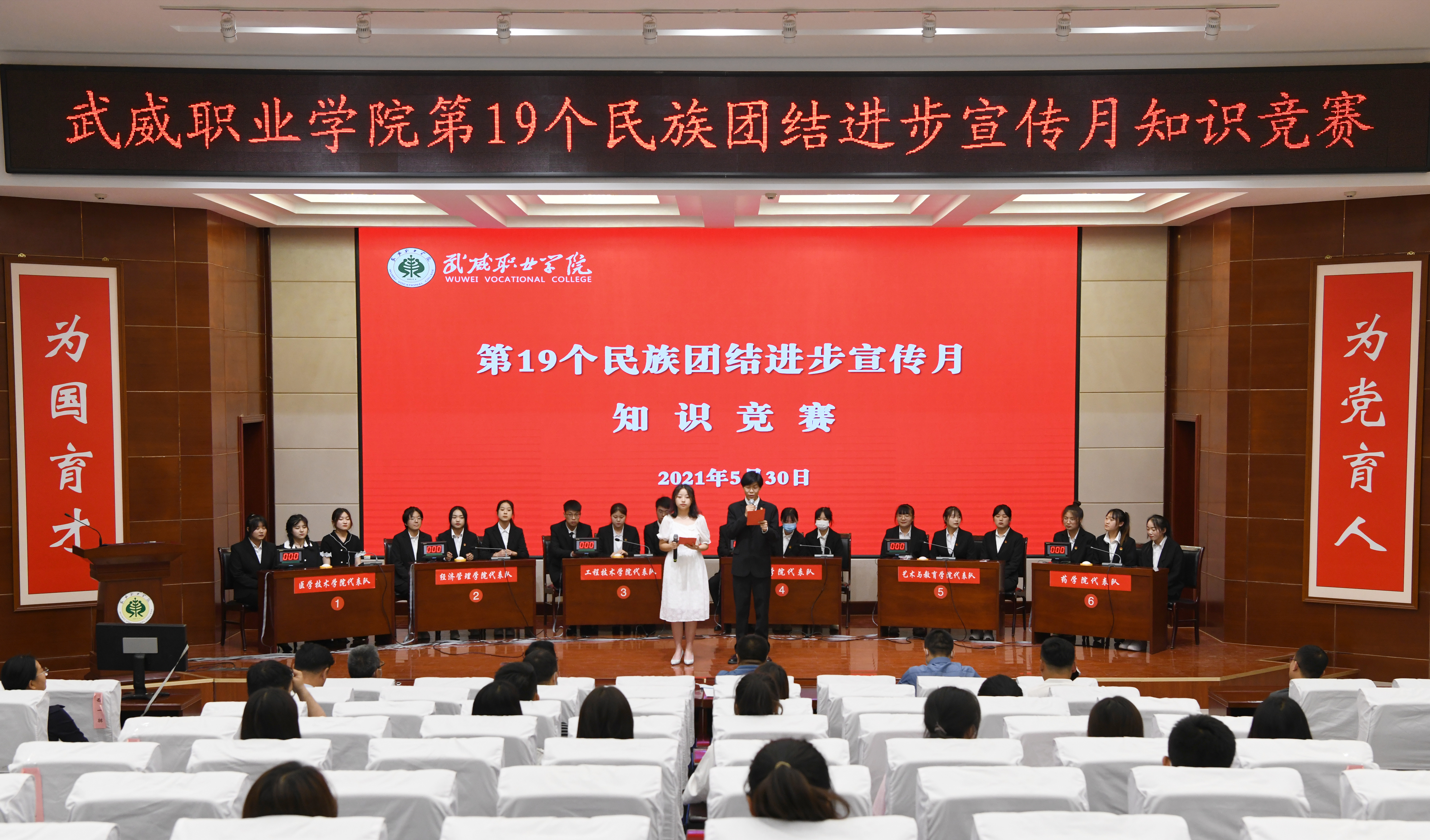 經(jīng)過前期的初賽、復(fù)賽,共有6支參賽隊(duì)進(jìn)入知識(shí)競(jìng)賽決賽,競(jìng)賽內(nèi)容涵蓋了習(xí)近平新時(shí)代中國特色社會(huì)主義思想、中央民族工作會(huì)議精神、中華民族歷史發(fā)展知識(shí)、各民族優(yōu)秀傳統(tǒng)文化、中國夢(mèng)等方面內(nèi)容,充分彰顯了中華民族一家親、同心共筑中夢(mèng)的精神。競(jìng)賽中,參賽選手以飽滿的精神,踴躍答題,你追我趕,氣氛十分熱烈。經(jīng)過激烈的角逐,藥學(xué)院獲得此次知識(shí)競(jìng)賽第一名。醫(yī)學(xué)技術(shù)學(xué)院獲得學(xué)校第19個(gè)民族團(tuán)結(jié)進(jìn)步宣傳月系列活動(dòng)優(yōu)秀組織獎(jiǎng)。