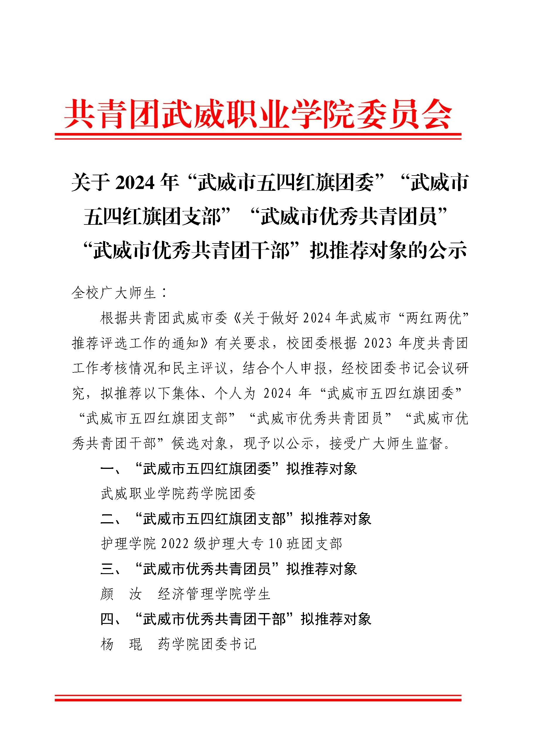 關(guān)于2024年“武威青年五四獎?wù)隆啊毙聲r(shí)代武威好青年“擬推薦對象的公示