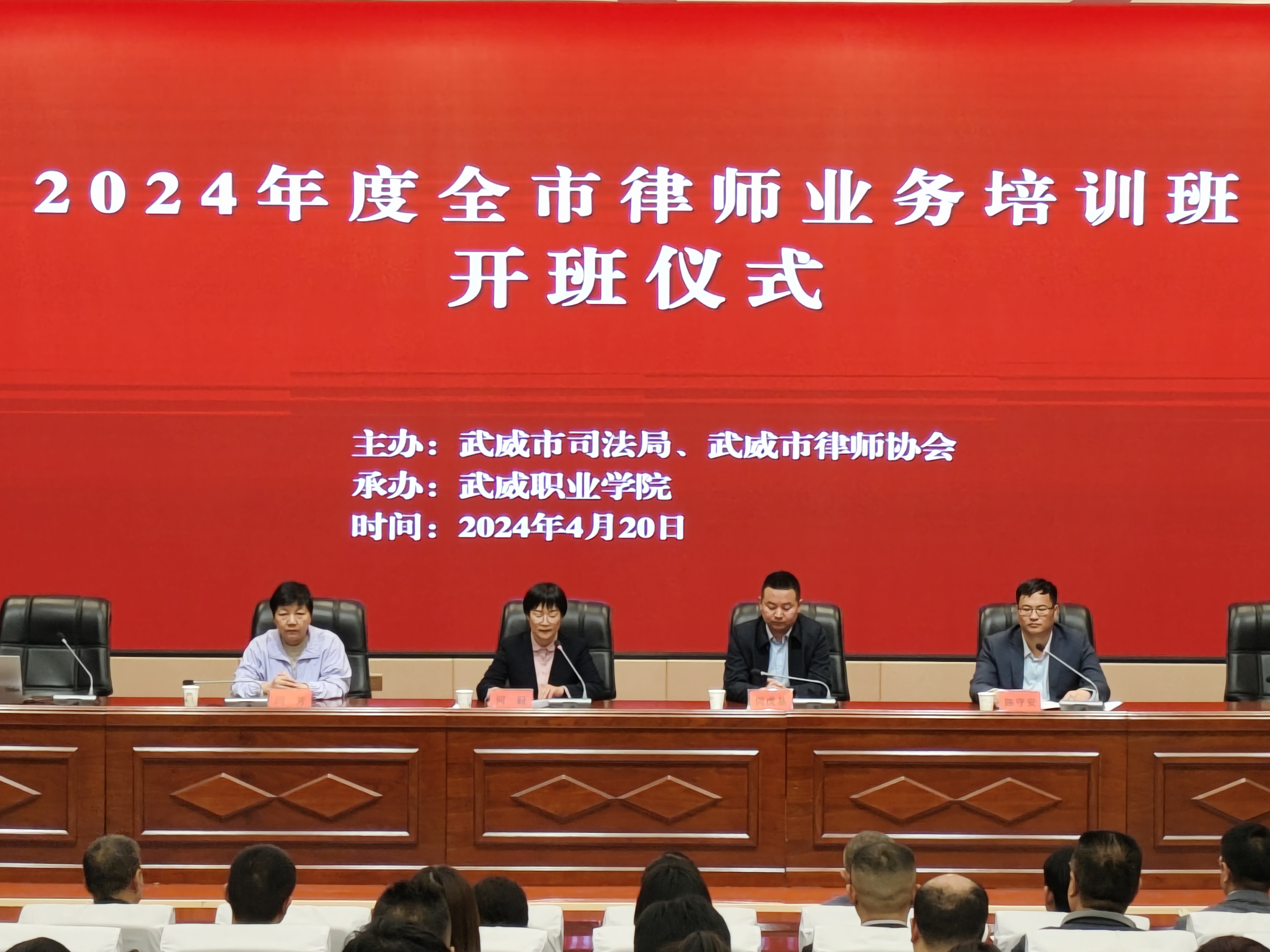 4月20日上午,由武威市司法局、武威市律師協(xié)會主辦,武威職業(yè)學(xué)院承辦的2024年度武威市律師業(yè)務(wù)培訓(xùn)班在學(xué)生發(fā)展中心箐英廳舉行開班儀式。武威職業(yè)學(xué)院黨委委員、副校長何毅,武威市司法局黨組成員、副局長,市律師行業(yè)黨委書記何虎基,武威市司法局律師和法律職業(yè)資格管理科長閆芳出席開班儀式。武威市律師協(xié)會會長、市律師行業(yè)黨委副書記陳守安主持開班儀式。全市注冊的專(兼)職律師、法援律師、公職律師、公司律師及實習(xí)律師共計220人參加開班儀式。
