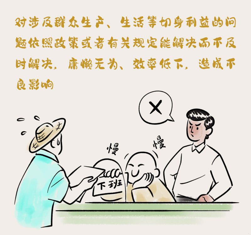 (一)對涉及群眾生產(chǎn)、生活等切身利益的問題依照政策或者有關(guān)規(guī)定能解決而不及時解決,庸懶無為、效率低下,造成不良影響;