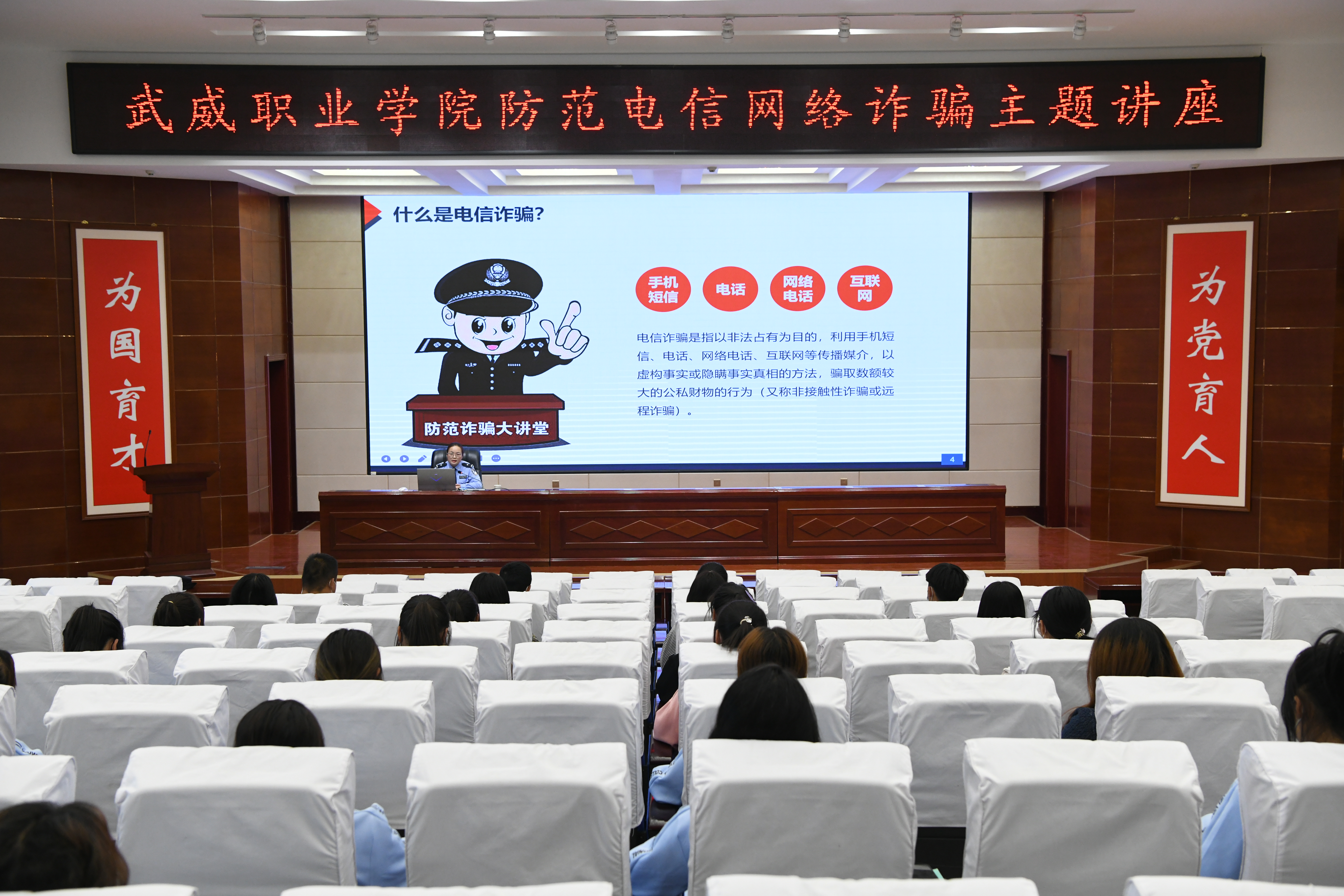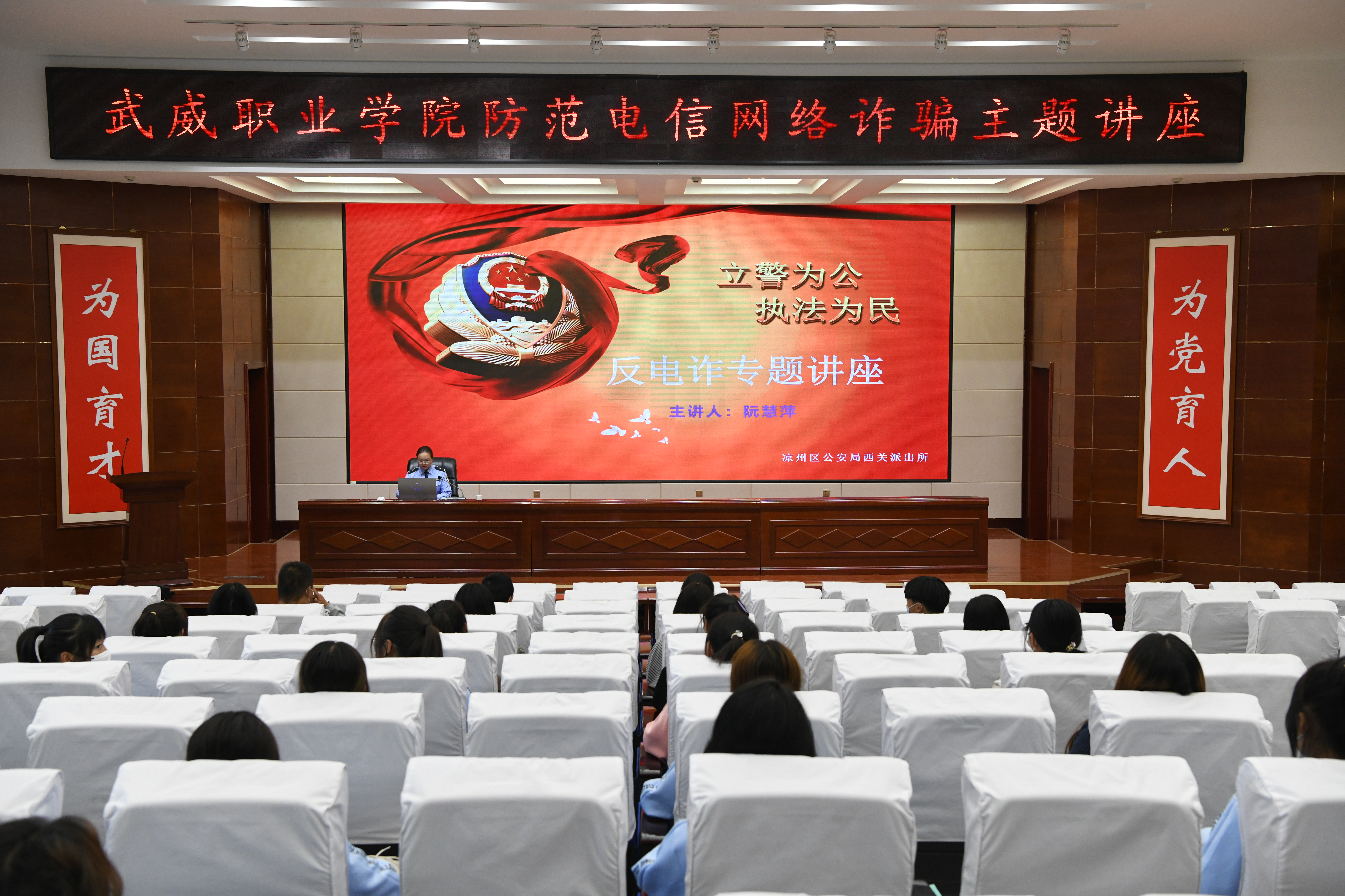 為了提高學校師生識別和防范電信網(wǎng)絡詐騙的能力,切實做好防范電信網(wǎng)絡詐騙宣傳教育工作。9月30日,學校聯(lián)合武威市公安局涼州分局西關(guān)派出所在學生發(fā)展中心菁英廳舉辦防范電信網(wǎng)絡詐騙專題講座。各二級學院師生代表聆聽了講座,講座由安全保衛(wèi)處負責人李欣主持。