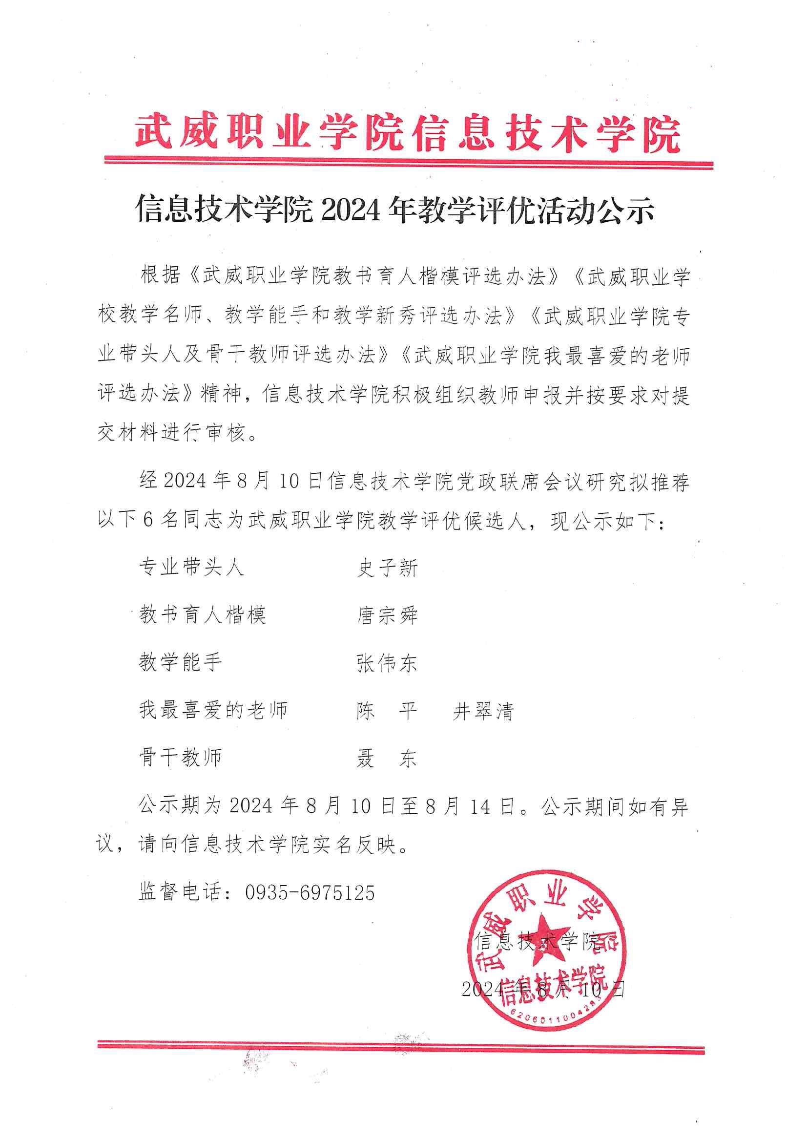 信息技術(shù)學院關(guān)于2024年教學評優(yōu)活動公示