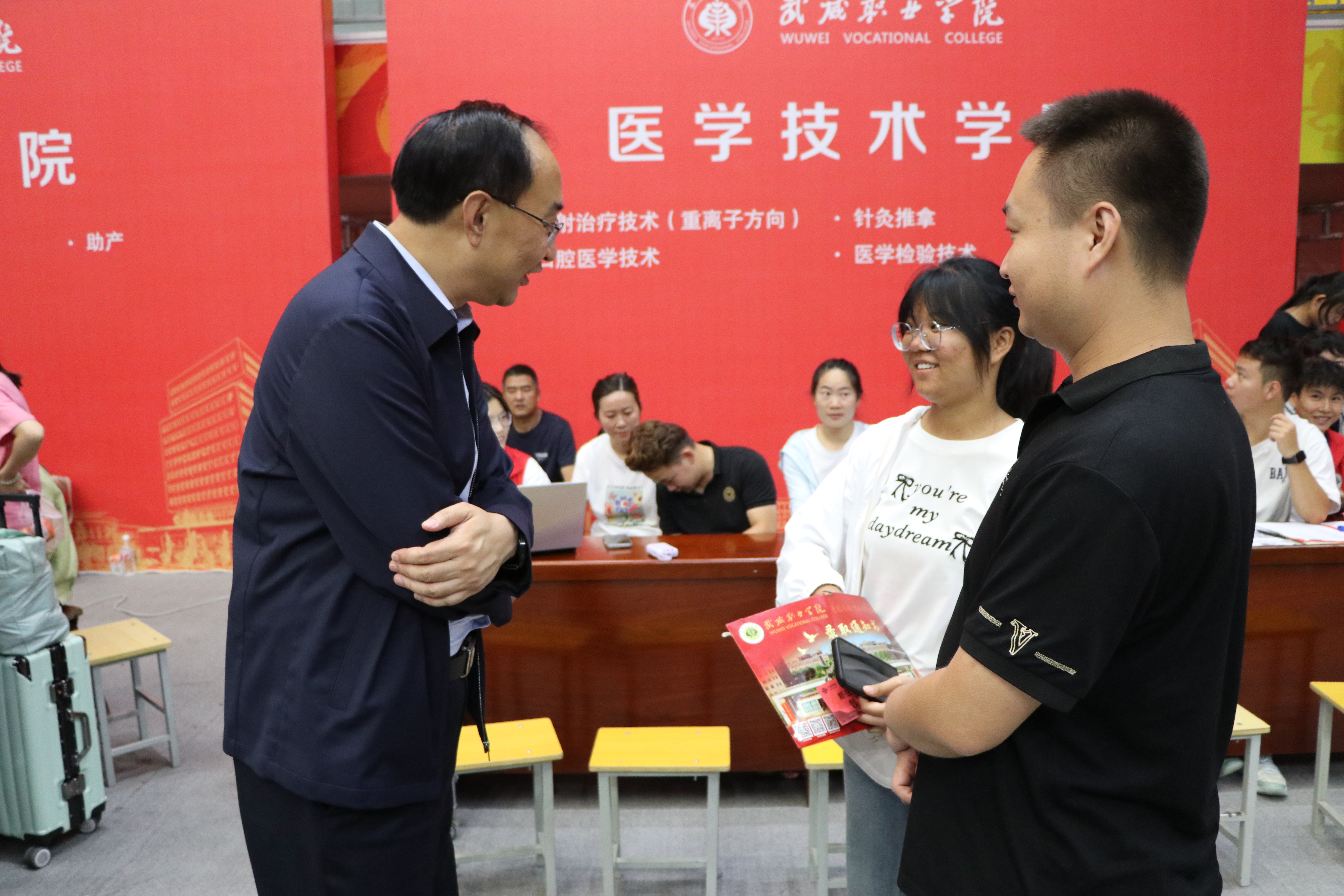 校領(lǐng)導(dǎo)一一走過新生報到處、綠色通道、繳費(fèi)處和各二級學(xué)院迎新報到點(diǎn),了解新生報到情況,仔細(xì)詢問智慧學(xué)工平臺使用情況,親切問候堅守崗位的師生志愿者。在醫(yī)學(xué)技術(shù)學(xué)院報到點(diǎn)前,王宏與2024級放射治療技術(shù)(重離子方向)新生及家長聊了起來——“歡迎你們來到武威職業(yè)學(xué)院學(xué)習(xí)!為什么會報考這個專業(yè)?”在得知學(xué)生家庭中有人從事重離子醫(yī)療領(lǐng)域的研發(fā)工作時,王宏勉勵新生要努力學(xué)好專業(yè)、練好技能,爭做高素質(zhì)技術(shù)技能人才。在家長休息區(qū),王宏與來自甘肅慶陽的新生家長親切交談,并介紹了學(xué)校的辦學(xué)情況,建議學(xué)生和家長在校園里走一走看一看,多了解熟悉學(xué)校,幫助學(xué)生盡快適應(yīng)大學(xué)生活,并祝愿學(xué)生家長在武期間,一切順利。