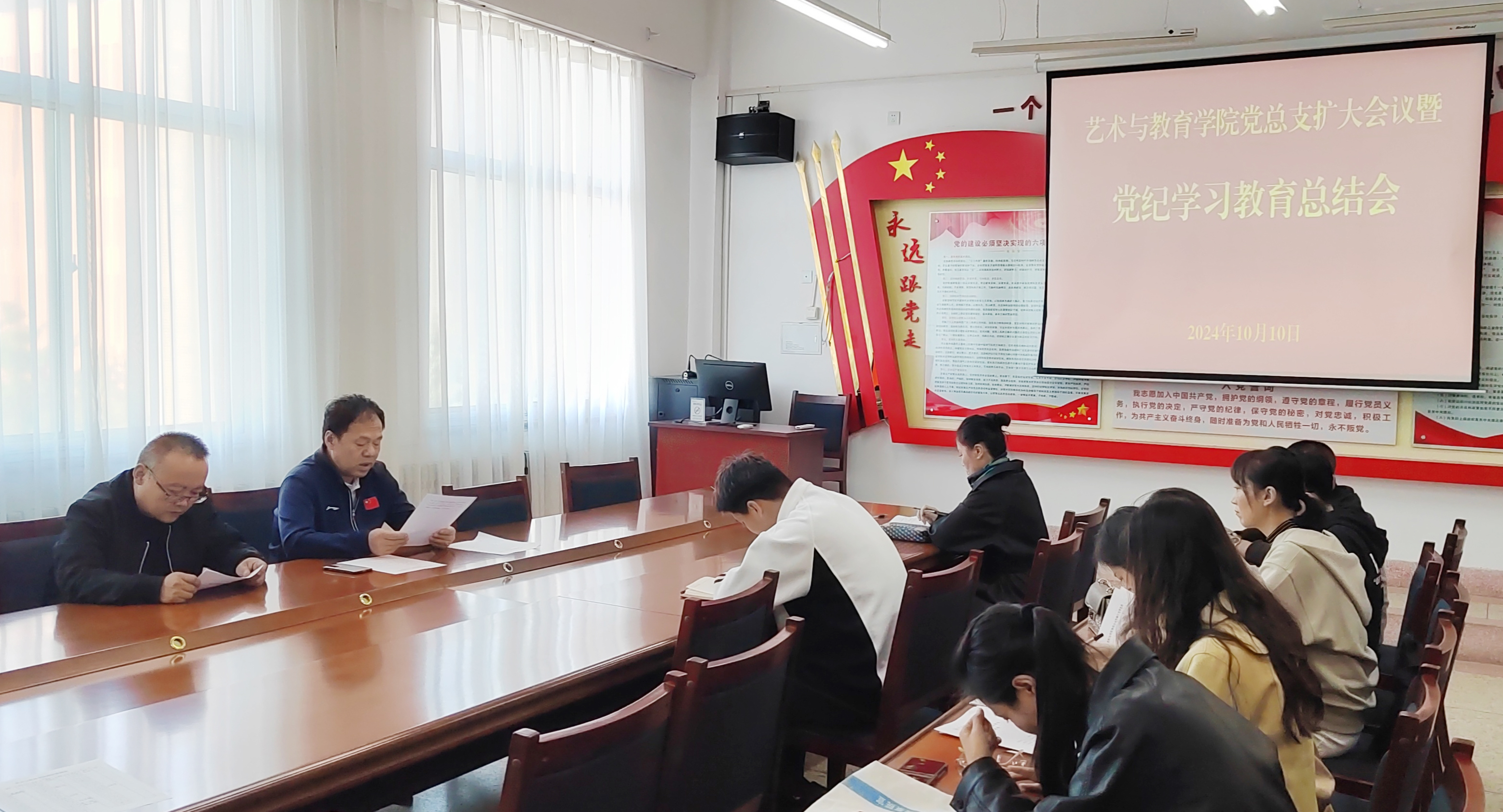 10月10日下午,學院黨總支擴大會議在勵勤樓209會議室舉行,會議學習傳達了習近平總書記在甘肅考察時的關于黨紀學習教育的重要講話和指示精神,黨的二十屆三中全會審議通過的《中共中央關于進一步全面深化改革、推進中國式現(xiàn)代化的決定》中關于黨紀學習教育的有關內(nèi)容和中央、省委、市委、學校黨委黨紀學習教育總結(jié)大會精神,總結(jié)了藝術與教育學院黨總支黨紀學習教育開展情況。會議由黨總支書記王政主持,學院各黨支部委員參加,全體行政人員列席。