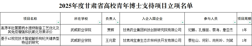 近日,甘肅省教育廳公布了2025年度甘肅省高校青年博士支持項目評審結果公示,我校賈輝博士主持的《高原羊肚菌菌柄水提物制備工藝優(yōu)化及其免疫增強和抗氧化效果評價》和王兆君博士主持的《基于AI視覺技術智能解析枸杞關鍵表型特征的研究》2個研究項目成功獲批。