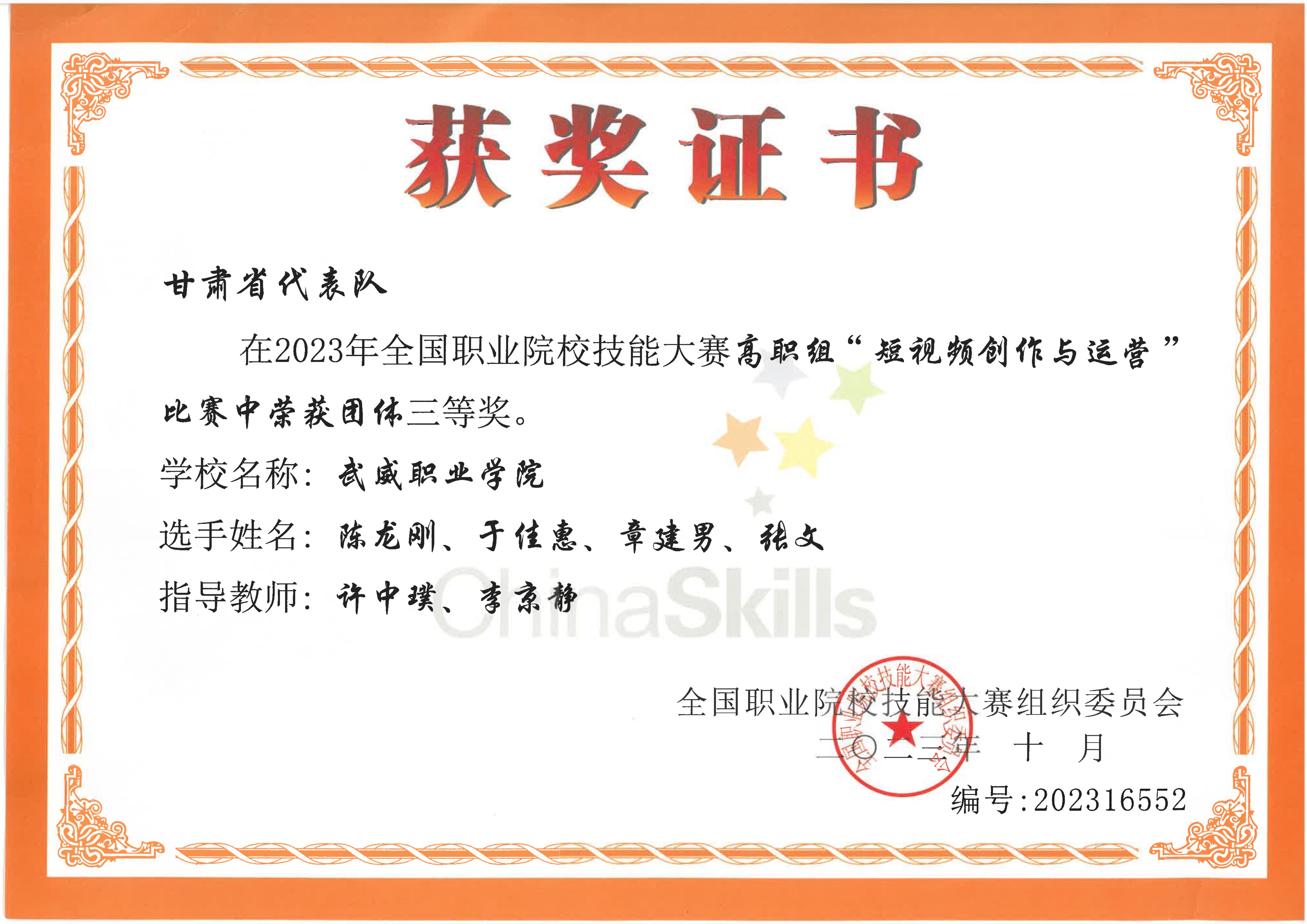 學(xué)生獲2023年全國職業(yè)院校技能大賽高職組短視頻創(chuàng)作與運營三等獎