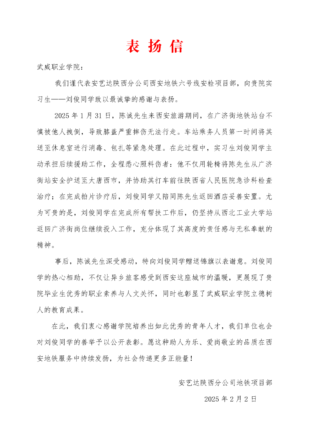 近日,武威職業(yè)學(xué)院計(jì)算機(jī)應(yīng)用技術(shù)專業(yè)2025屆畢業(yè)生劉俊在西安地鐵實(shí)習(xí)期間,主動(dòng)救助因突發(fā)意外受傷的乘客,展現(xiàn)了當(dāng)代青年學(xué)子的責(zé)任擔(dān)當(dāng)。其事跡獲得被救助乘客及實(shí)習(xí)單位的高度評(píng)價(jià),乘客陳先生向劉俊同學(xué)贈(zèng)送錦旗以表謝意,實(shí)習(xí)單位安藝達(dá)陜西分公司地鐵項(xiàng)目部特向?qū)W校發(fā)來(lái)表?yè)P(yáng)信,稱贊其“以行動(dòng)詮釋服務(wù)精神,用愛(ài)心彰顯職業(yè)素養(yǎng)”。