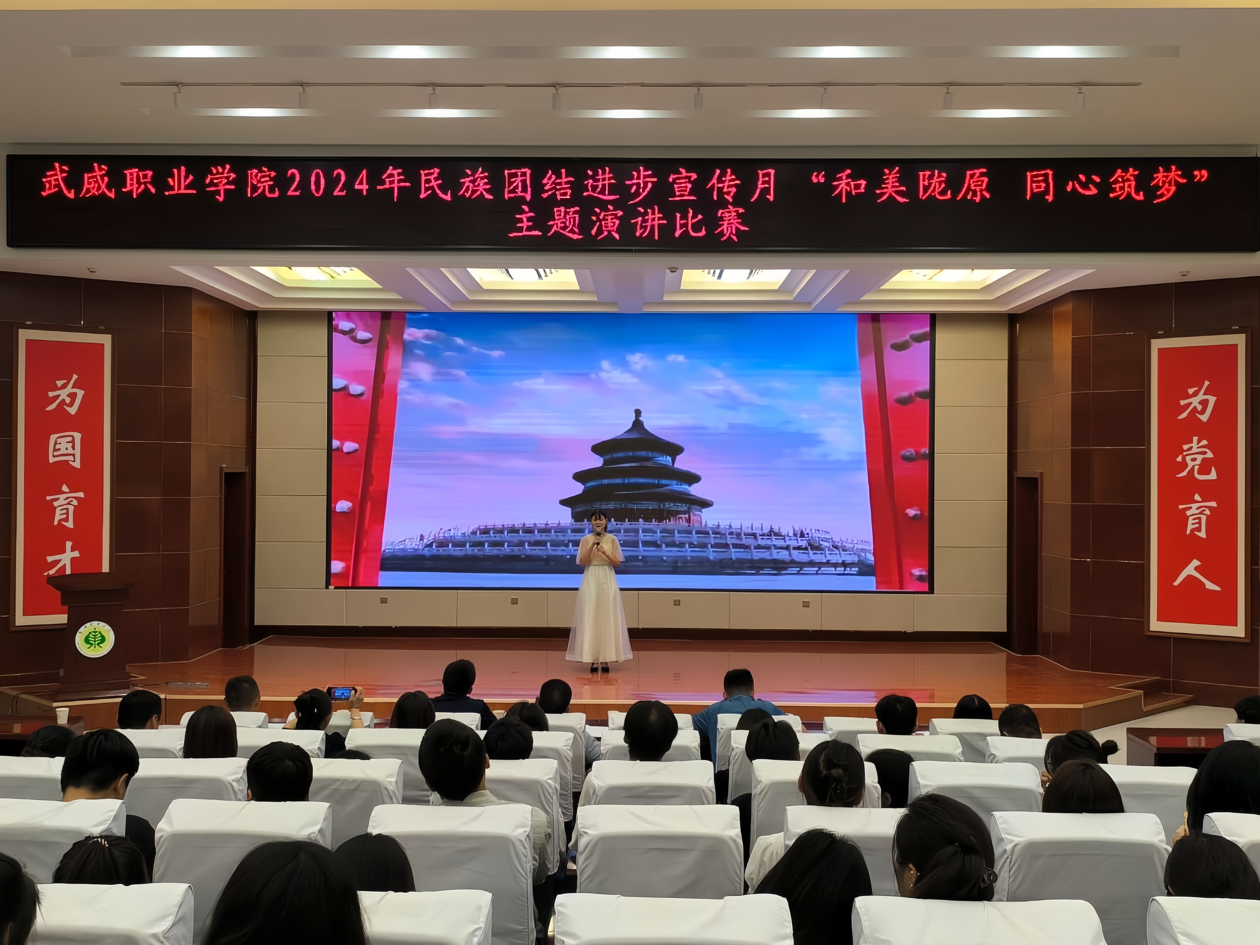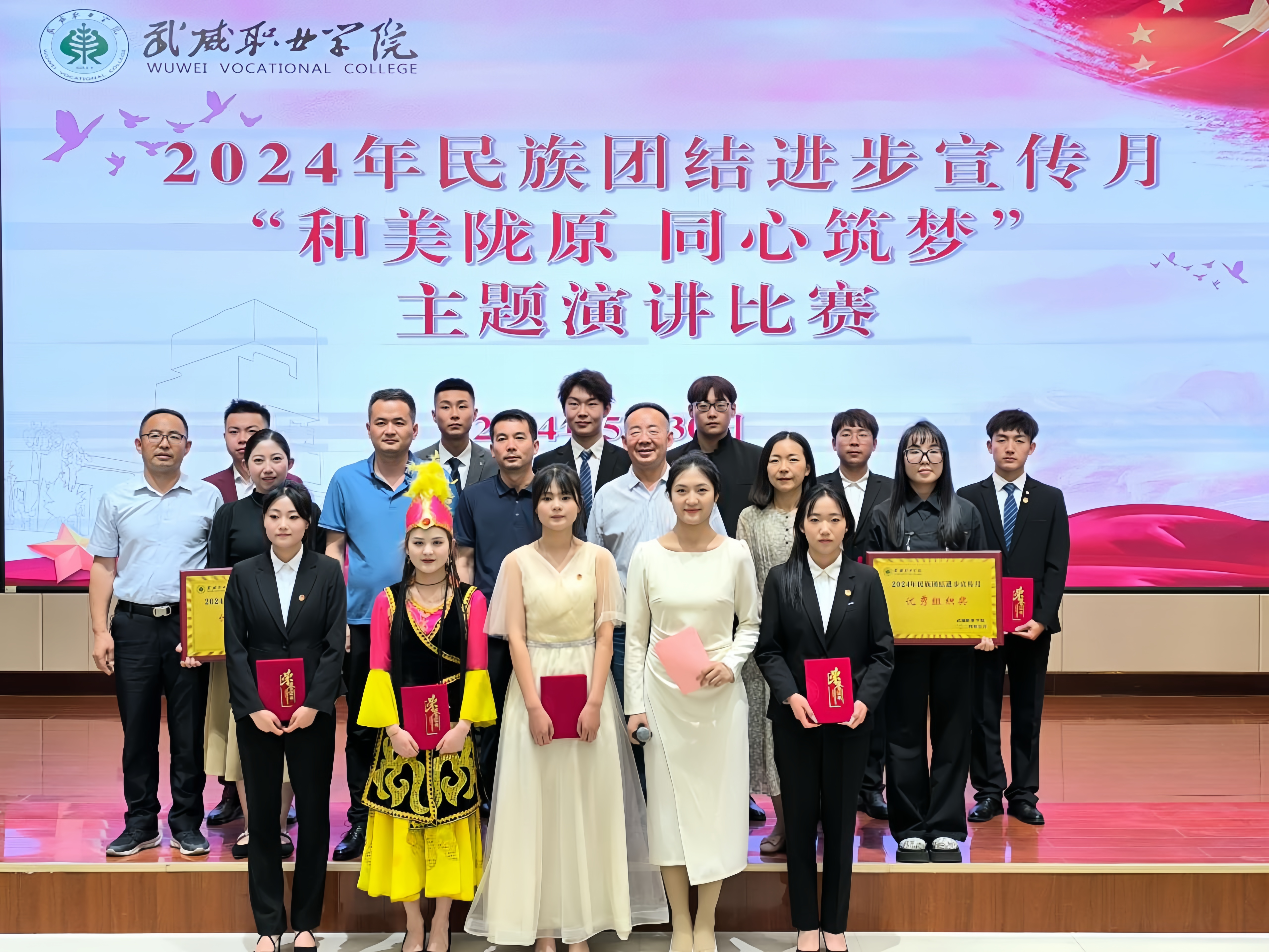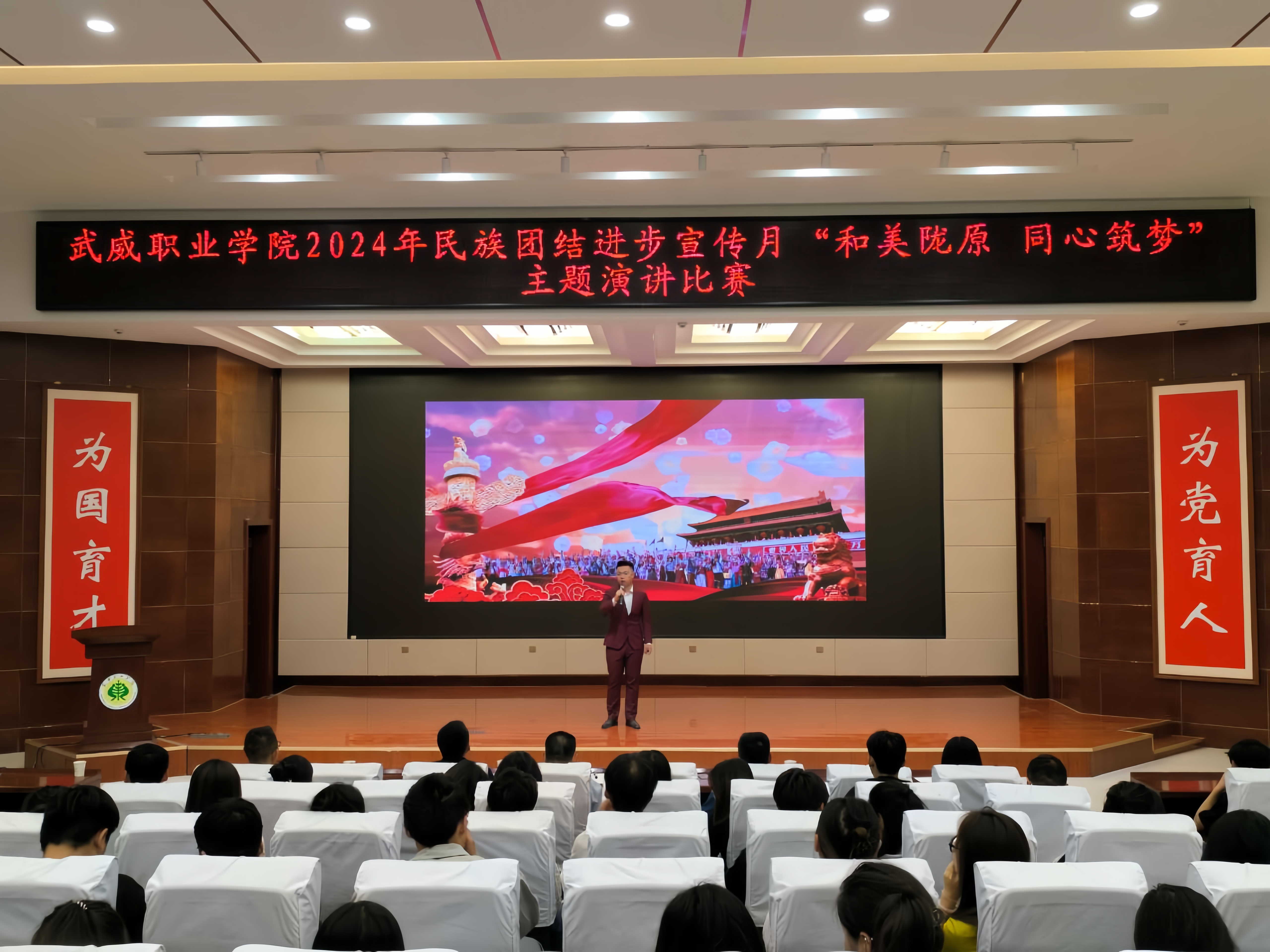 為持續(xù)深化民族團結(jié)進步教育,進一步引導(dǎo)各族師生牢固樹立“四個與共”的共同體理念。學(xué)校于5月30日晚在學(xué)生發(fā)展中心菁英廳舉辦了“和美隴原 同心筑夢”主題演講比賽。200余名師生參加活動。