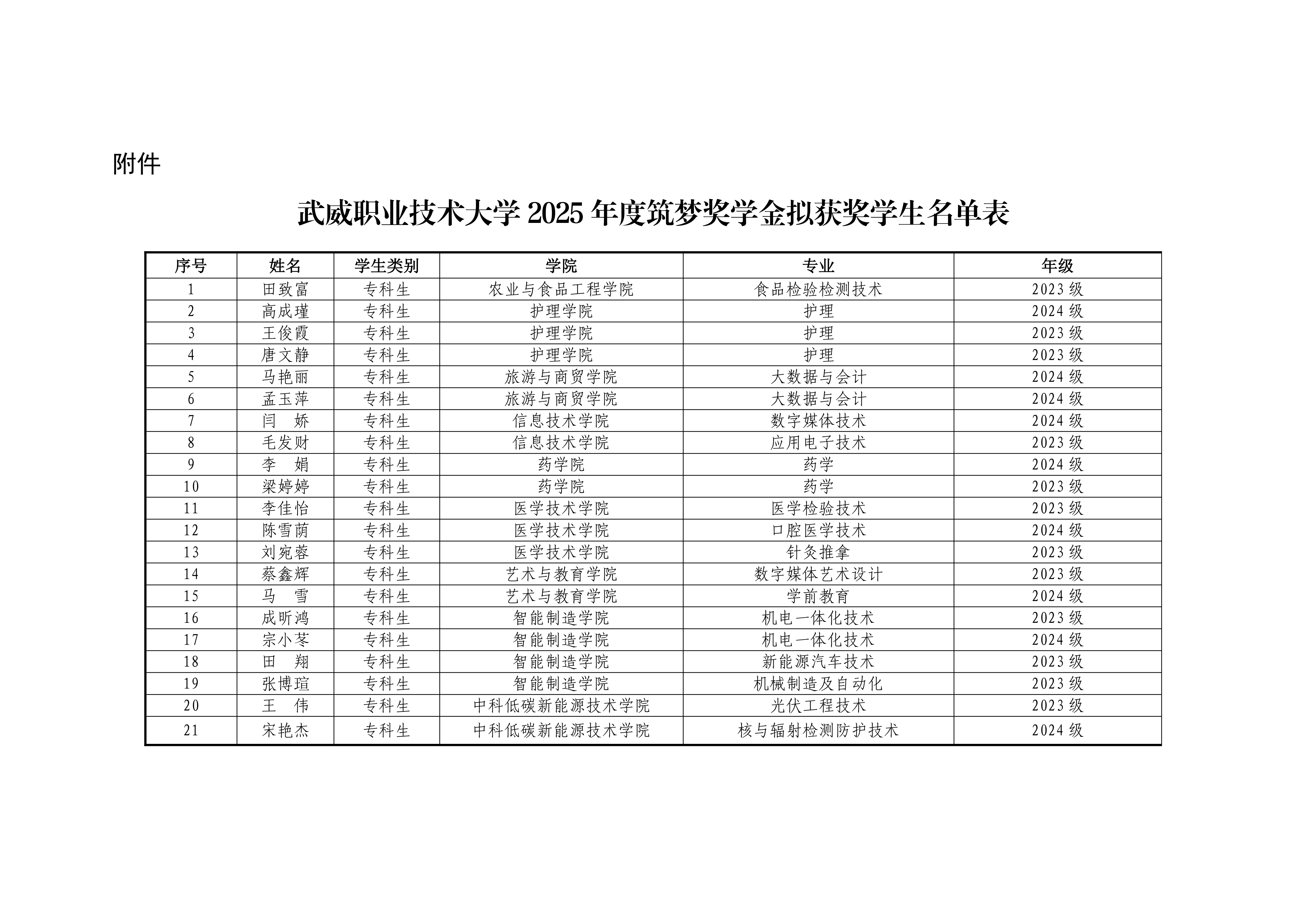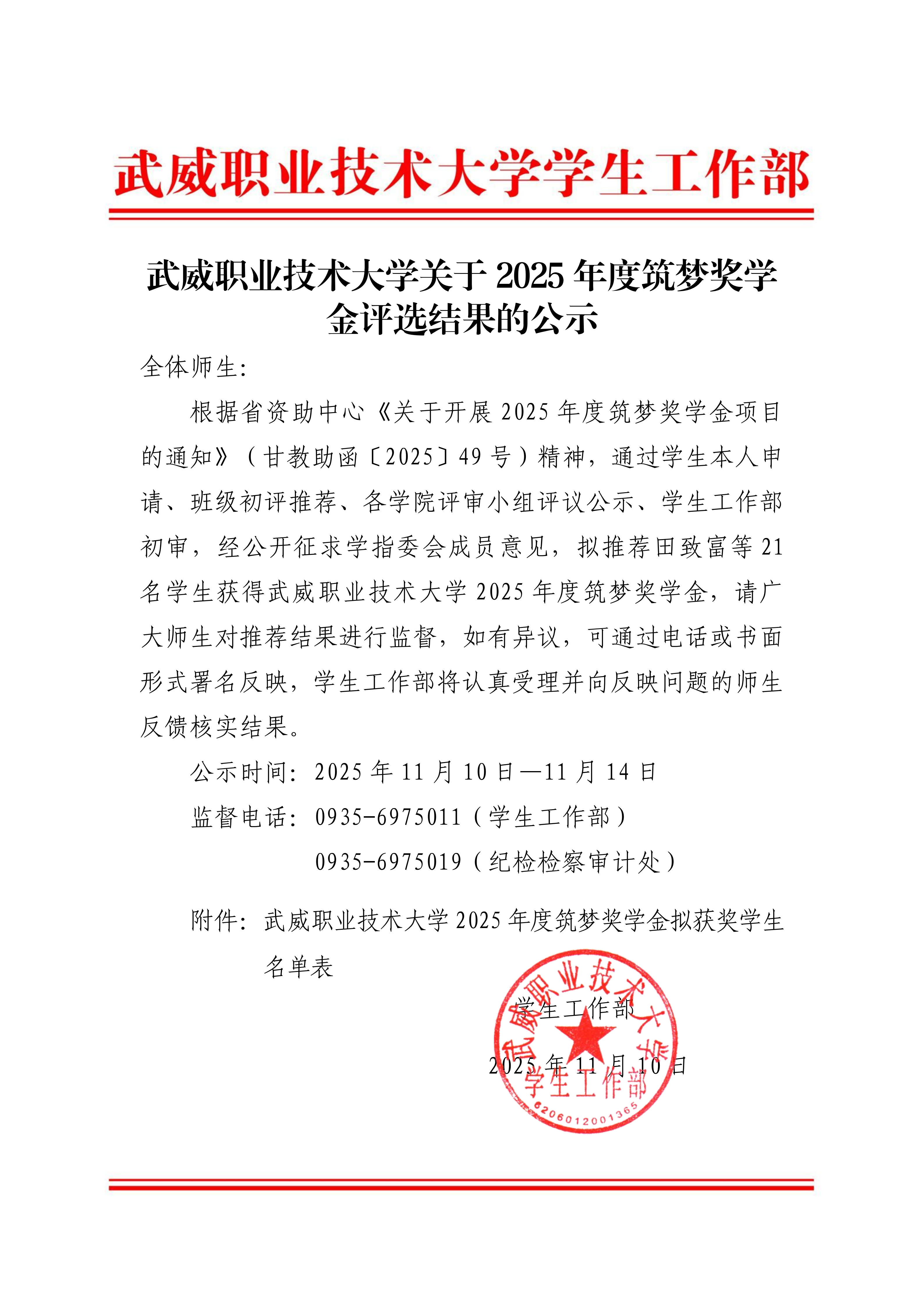 武威職業(yè)技術(shù)大學(xué)關(guān)于2025年度筑夢(mèng)獎(jiǎng)學(xué)金評(píng)選結(jié)果的公示