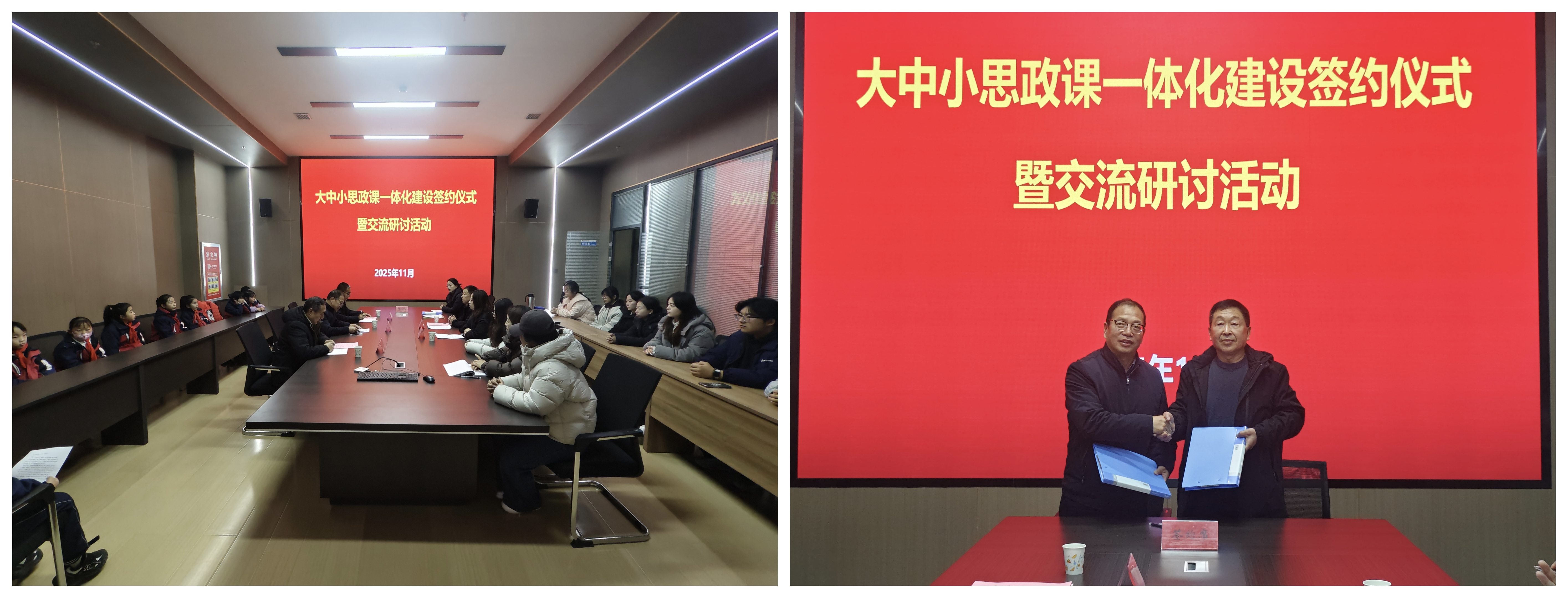 簽約儀式上,劉心和徐主年分別致辭,雙方共同簽署了《大中小學(xué)思政課一體化共建協(xié)議書》,并圍繞共建目標(biāo)、合作內(nèi)容與實(shí)施機(jī)制進(jìn)行了深入交流。此次合作簽約為院校雙方搭建了資源共享、優(yōu)勢(shì)互補(bǔ)、協(xié)同育人的平臺(tái),希望雙方在師資隊(duì)伍共建、實(shí)踐資源共享、課程創(chuàng)新突破等方面多維度協(xié)同推進(jìn),不斷探索一體化建設(shè)的長(zhǎng)效機(jī)制,打破各學(xué)段在課程、資源、師資等方面的壁壘,實(shí)現(xiàn)有機(jī)銜接,促進(jìn)優(yōu)質(zhì)教學(xué)經(jīng)驗(yàn)互鑒、特色教學(xué)模式推廣,共同提升立德樹人效果。