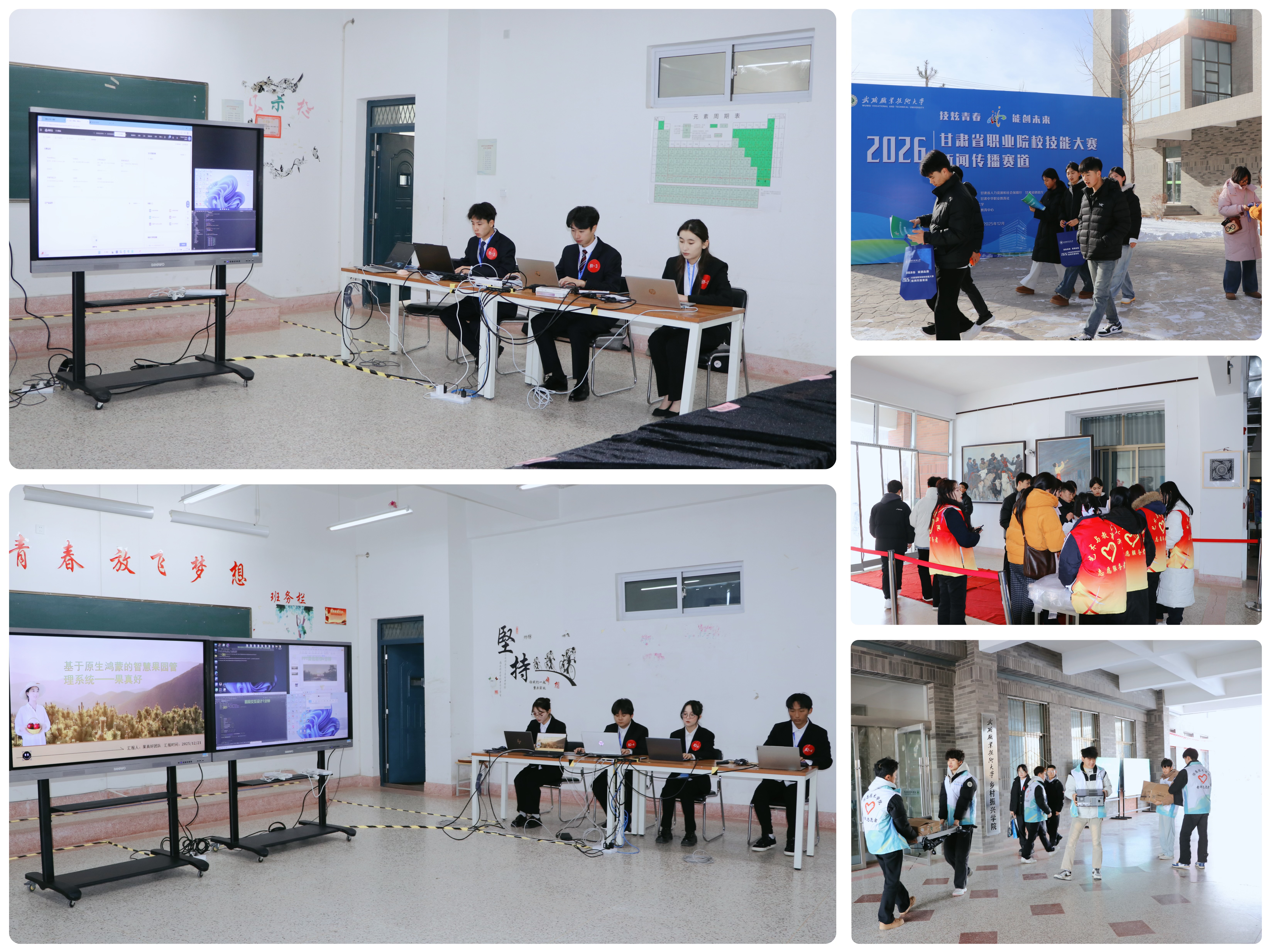 12月21日,學(xué)校黨委書記王宏帶隊深入學(xué)校承辦的甘肅省2026年職業(yè)院校技能大賽比賽現(xiàn)場,實地巡查高職組新聞傳播賽道、新一代信息技術(shù)賽道的比賽情況。賽點監(jiān)督仲裁組組長汪霞、成員王立榮、陳曉煜,學(xué)校教務(wù)處負(fù)責(zé)同志一同巡查。