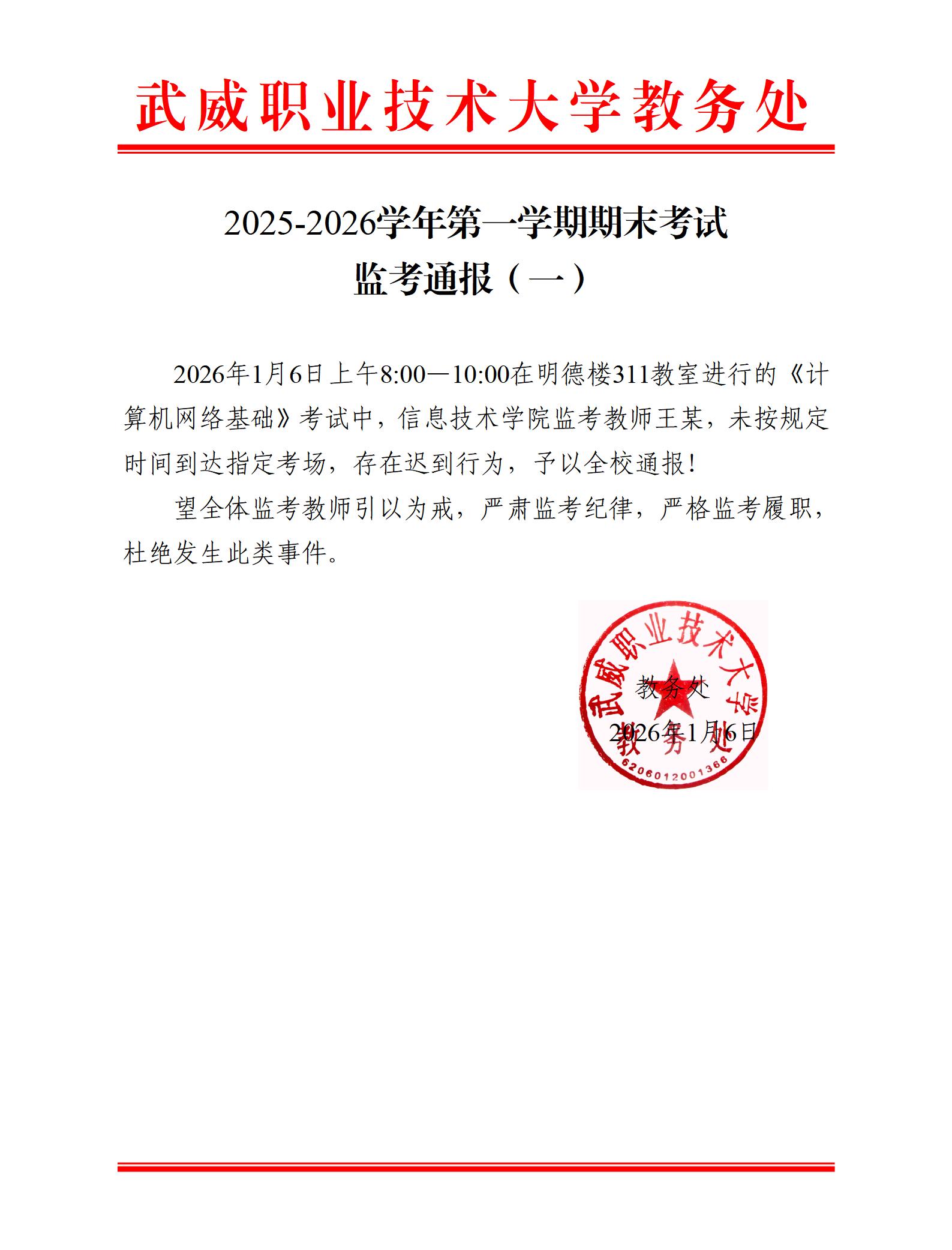 2025-2026學(xué)年第一學(xué)期期末考試監(jiān)考通報(bào)(一)