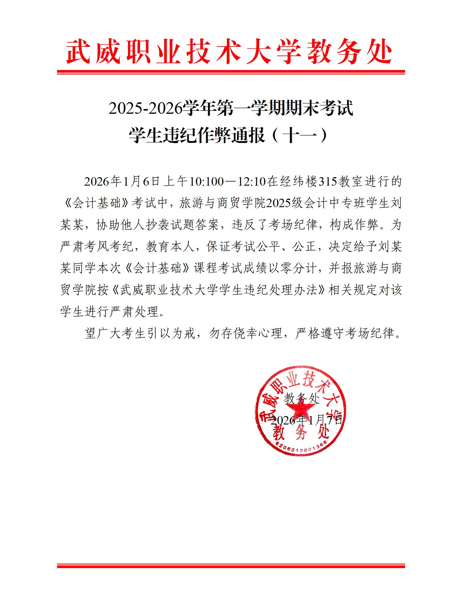 2025-2026學(xué)年第一學(xué)期期末考試學(xué)生違紀(jì)作弊通報(bào)(十一)